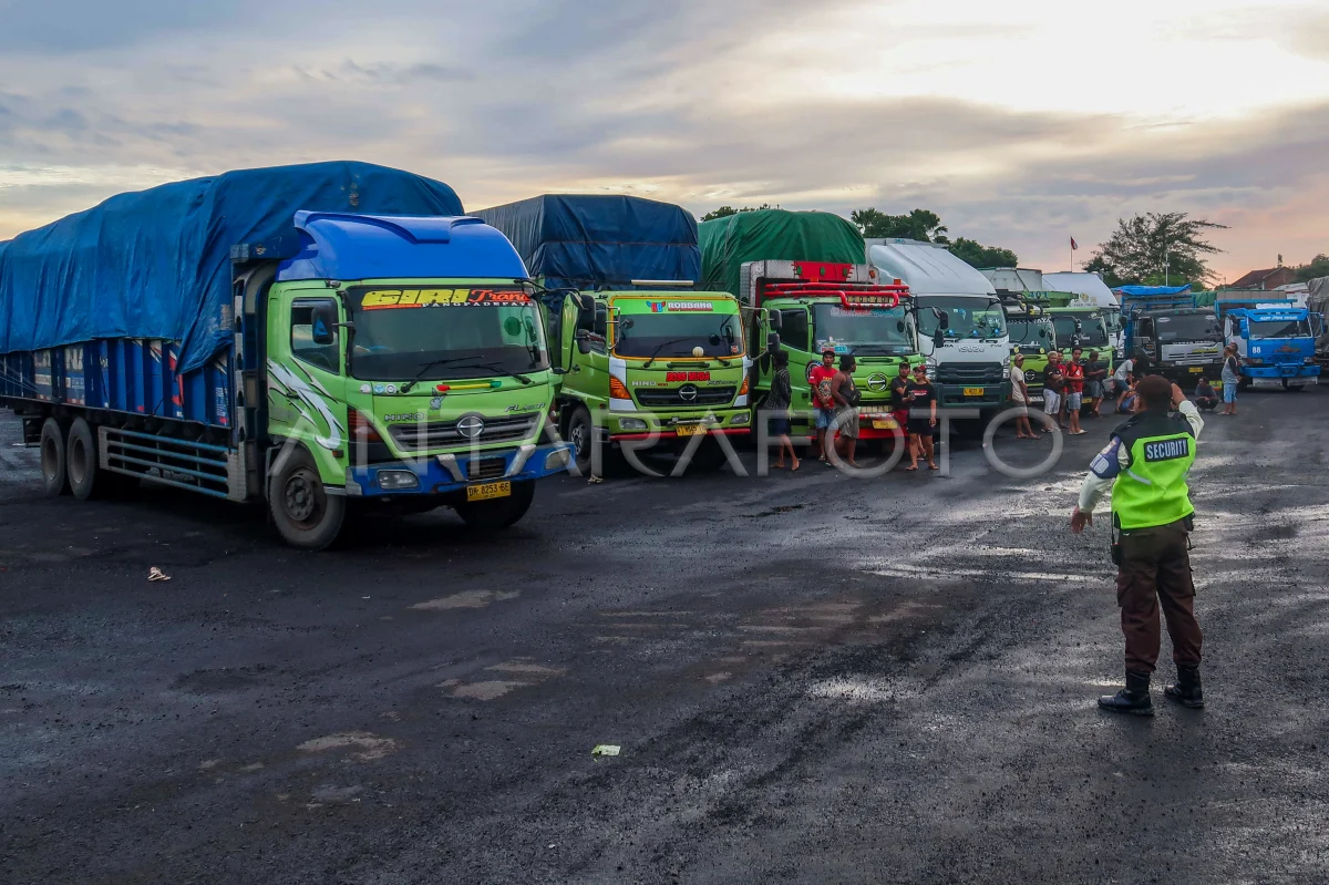 Petugas mengarahkan truk pengangkut logistik parkir di kantong parkir Dermaga Bulusan, Pelabuhan Ketapang, Banyuwangi, Jawa Timur, Minggu (22/12/2024). PT ASDP Ketapang menyiapkan 3 kantong parkir untuk kendaraan angkutan logistik yang terletak di Dermaga Bulusan, Terminal Sritanjung dan Watu Dodol untuk mengurai kepadatan kendaraan dari Jawa menuju Bali melalui Pelabuhan Ketapang selama masa libur Natal dan Tahun Baru 2025. ANTARA FOTO/Budi Candra Setya/agr