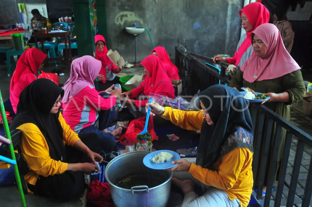 Relawan menyiapkan makanan di dapur umum korban banjir, Desa Pasuruan Lor, Jati, Kudus, Jawa Tengah, Sabtu (25/1/2025). Pemerintah setempat membuka sejumlah dapur umum yang tersebar di dua kecamatan yang terdampak guna membantu warga korban banjir di wilayah itu sejak Kamis (23/1/2025). ANTARA FOTO/Yusuf Nugroho/aww.
