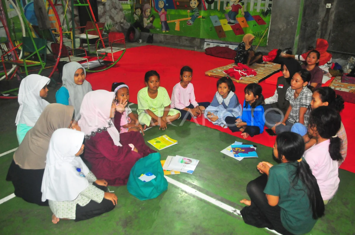 Sejumlah anak korban banjir mengikuti belajar bersama di posko pengungsian gedung TPQ Khurriyatul Fikri, Pasuruhan Lor, Jati, Kudus, Jawa Tengah, Sabtu (25/1/2025). BPBD Kudus mencatat saat ini sebanyak 82 warga korban banjir diungsikan ke tempat yang lebih aman di dua posko pengungsian. ANTARA FOTO/Yusuf Nugroho/Spt.