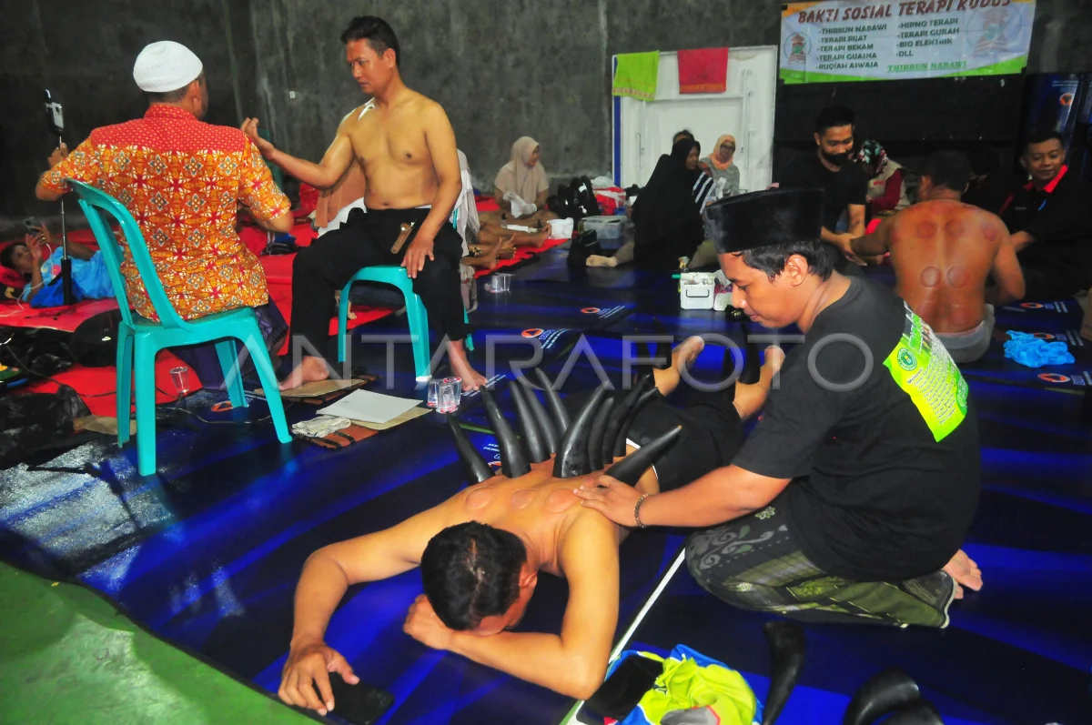 Warga korban banjir mengikuti terapi kesehatan di posko pengungsian gedung TPQ Khurriyatul Fikri, Pasuruhan Lor, Jati, Kudus, Jawa Tengah, Sabtu (25/1/2025). BPBD Kudus mencatat saat ini sebanyak 82 warga korban banjir diungsikan ke tempat yang lebih aman di dua posko pengungsian. ANTARA FOTO/Yusuf Nugroho/Spt.
