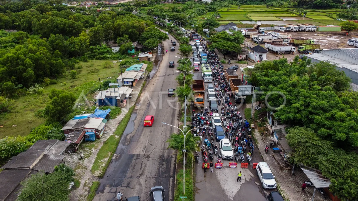 Foto udara suasana lalu lintas saat pemberlakuan sistem satu arah di Ciwandan, Kota Cilegon, Banten, Senin (27/1/2025). Polres Cilegon memberlakukan rekayasa lalu lintas sistem satu arah dari kawasan wisata pantai Anyer menuju Cilegon guna mengantisipasi terjadinya kepadatan kendaraan di wilayah Anyer. ANTARA FOTO/Muhammad Bagus Khoirunas/nym.