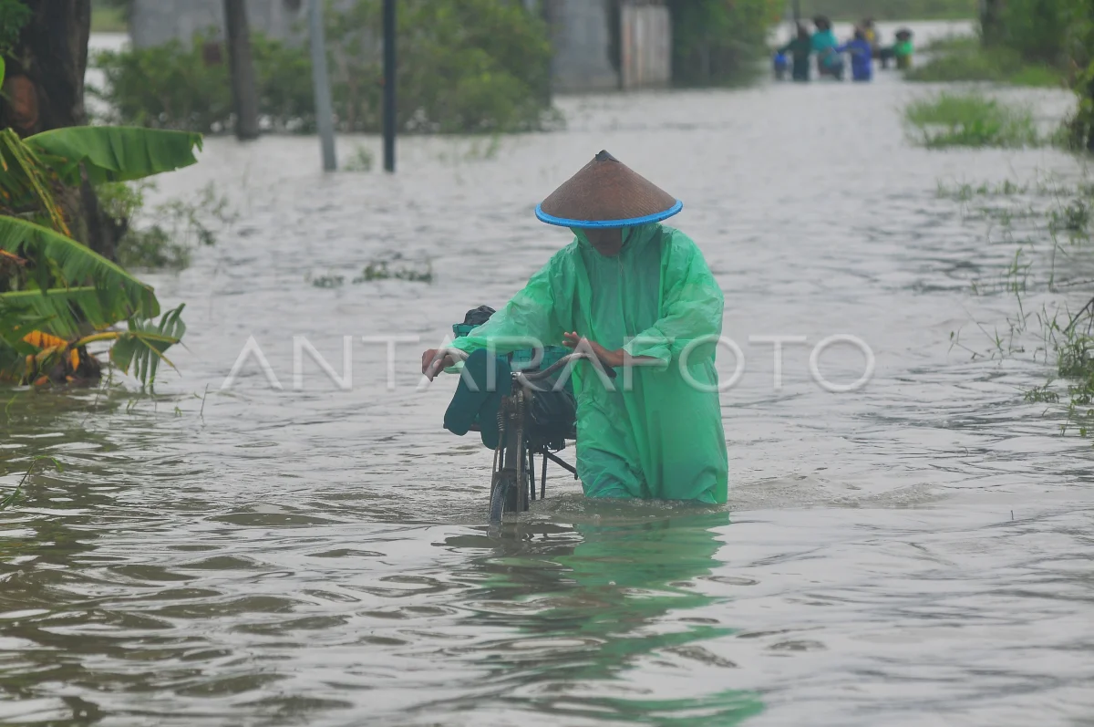 Warga berjalan menerobos jalan yang tergenang banjir di Dukuh Karangturi, Desa Setrokalangan, Kaliwungu, Kudus, Jawa Tengah, Jumat (31/1/2025). Menurut warga setempat, akses jalan utama sepanjang sekitar satu kilometer tersebut terendam banjir akibat meluapnya Sungai Wulan sejak Kamis (23/1/2025), dan sebanyak seribuan warga dari 450 KK terisolasi sehingga harus menggunakan perahu hingga menerobos banjir untuk menjalankan aktivitas sehari-hari. ANTARA FOTO/Yusuf Nugroho/foc.