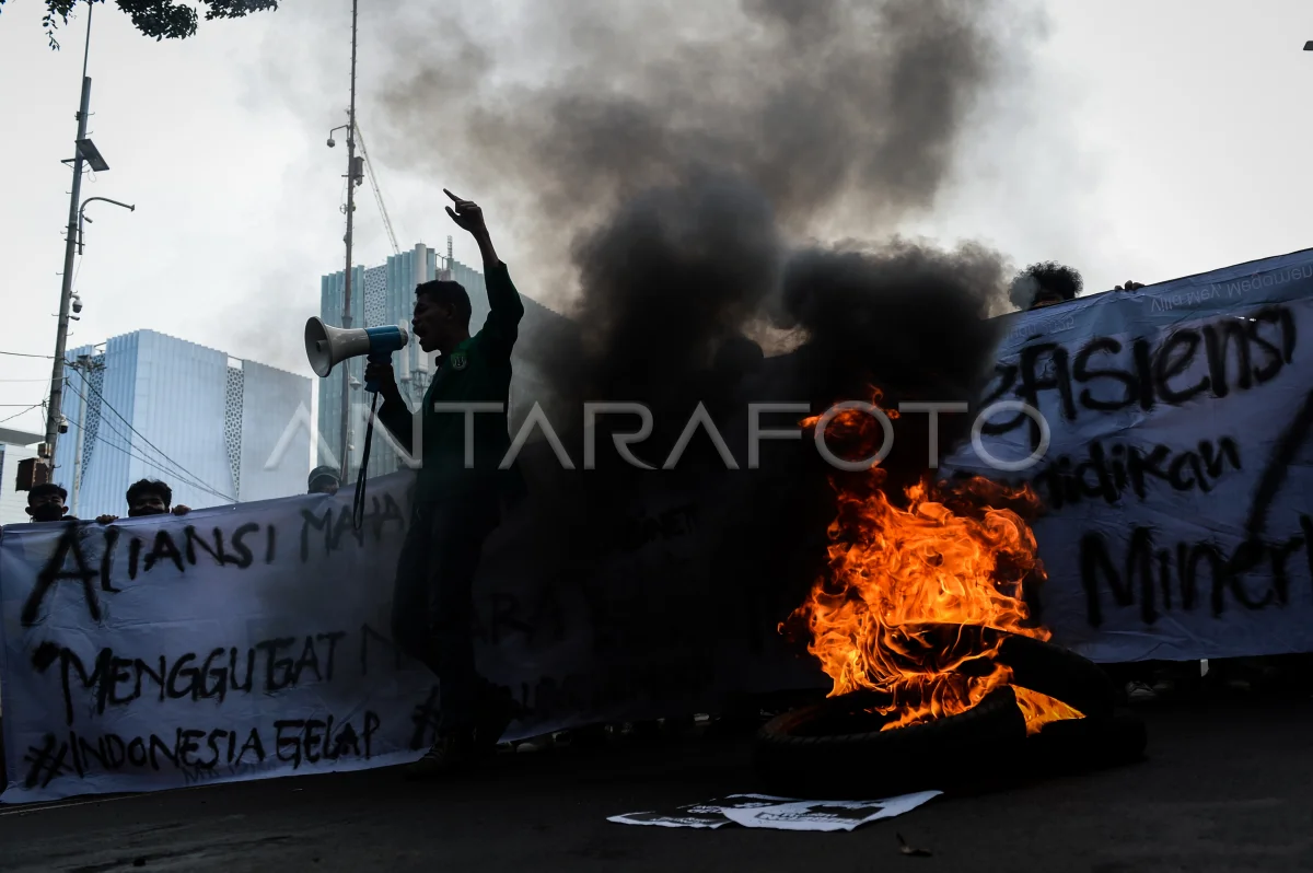 Sejumlah mahasiswa yang tergabung dalam BEM SI membentangkan spanduk saat unjuk rasa di Jakarta, Kamis (20/2/2025). Aksi bertajuk Indonesia Gelap yang diikuti ratusan mahasiswa tersebut menyuarakan sejumlah tuntutan diantaranya tingkatkan kualitas pendidikan dan kesehatan secara nasional. ANTARA FOTO/Putra M. Akbar/YU