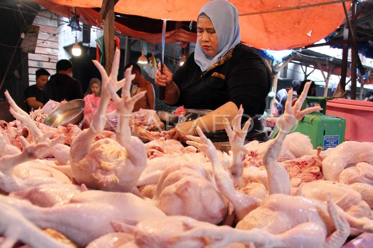 Pedagang ayam melayani pembeli di Pasar Brayan, Medan, Sumatera Utara, Selasa (25/2/2025). Menjelang Ramadhan harga sejumlah bahan pokok di pasar tersebut mengalami kenaikan seperti cabai merah dari Rp30 ribu menjadi Rp40 ribu per kilogram, daging sapi dari Rp110 ribu menjadi Rp130 ribu per kilogram, telur ayam dari Rp45 ribu per papan menjadi Rp60 ribu dan daging ayam dari Rp30 ribu menjadi Rp34 ribu per kilogram.ANTARA FOTO/Yudi Manar/Spt.