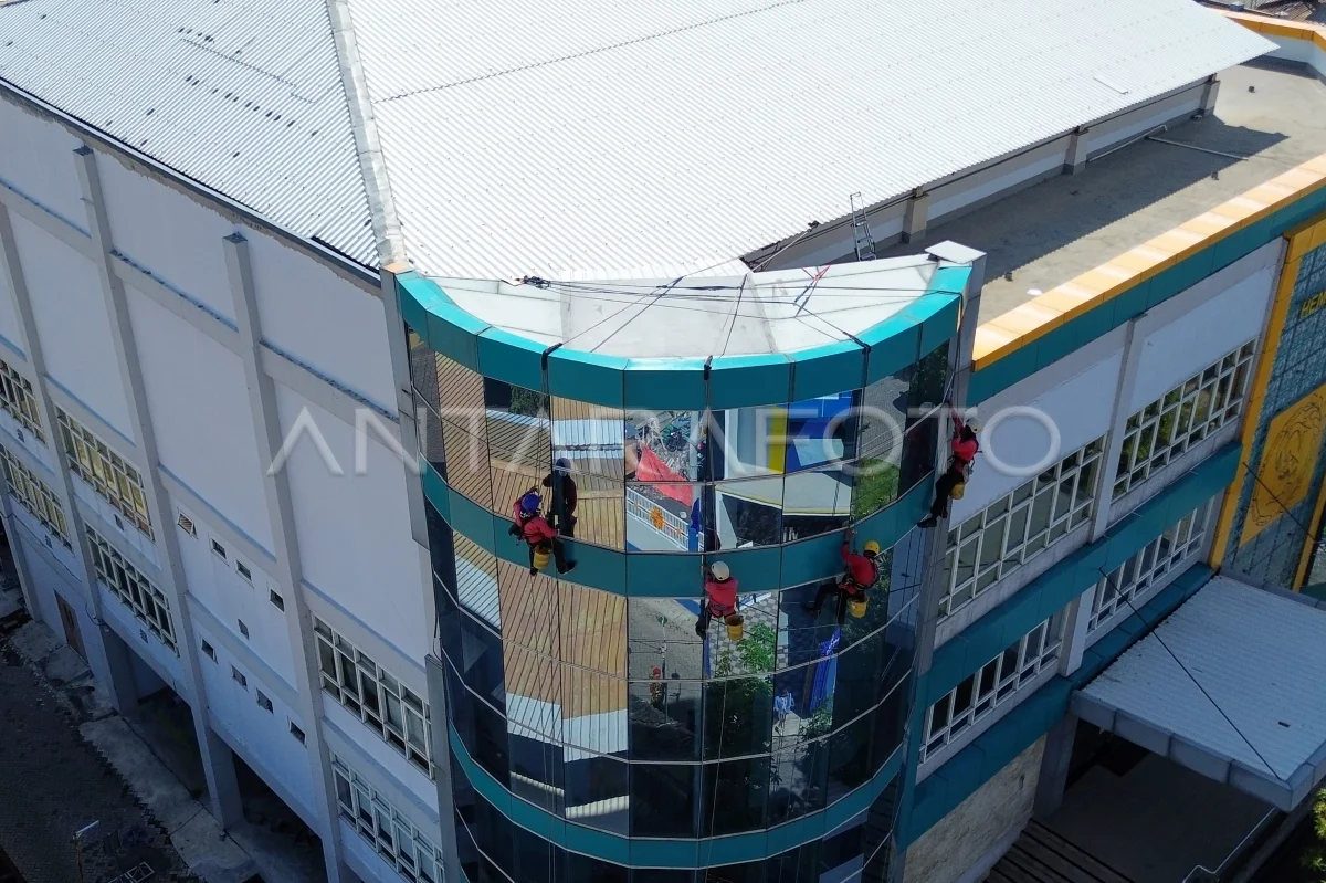 Foto udara pekerja membersihkan kaca dinding luar salah satu gedung di Sidoarjo, Jawa Timur, Sabtu (10/5/2025). Kementerian Ketenagakerjaan memperluas cakupan perlindungan kerja untuk meningkatkan kepastian perlindungan pada program Jaminan Kecelakaan Kerja (JKK) dan Jaminan Kematian (JKM) seiring perubahan diterbitkannya Peraturan Menteri Ketenagakerjaan atau Permenaker Nomor 1 Tahun 2025. ANTARA FOTO/Umarul /YU