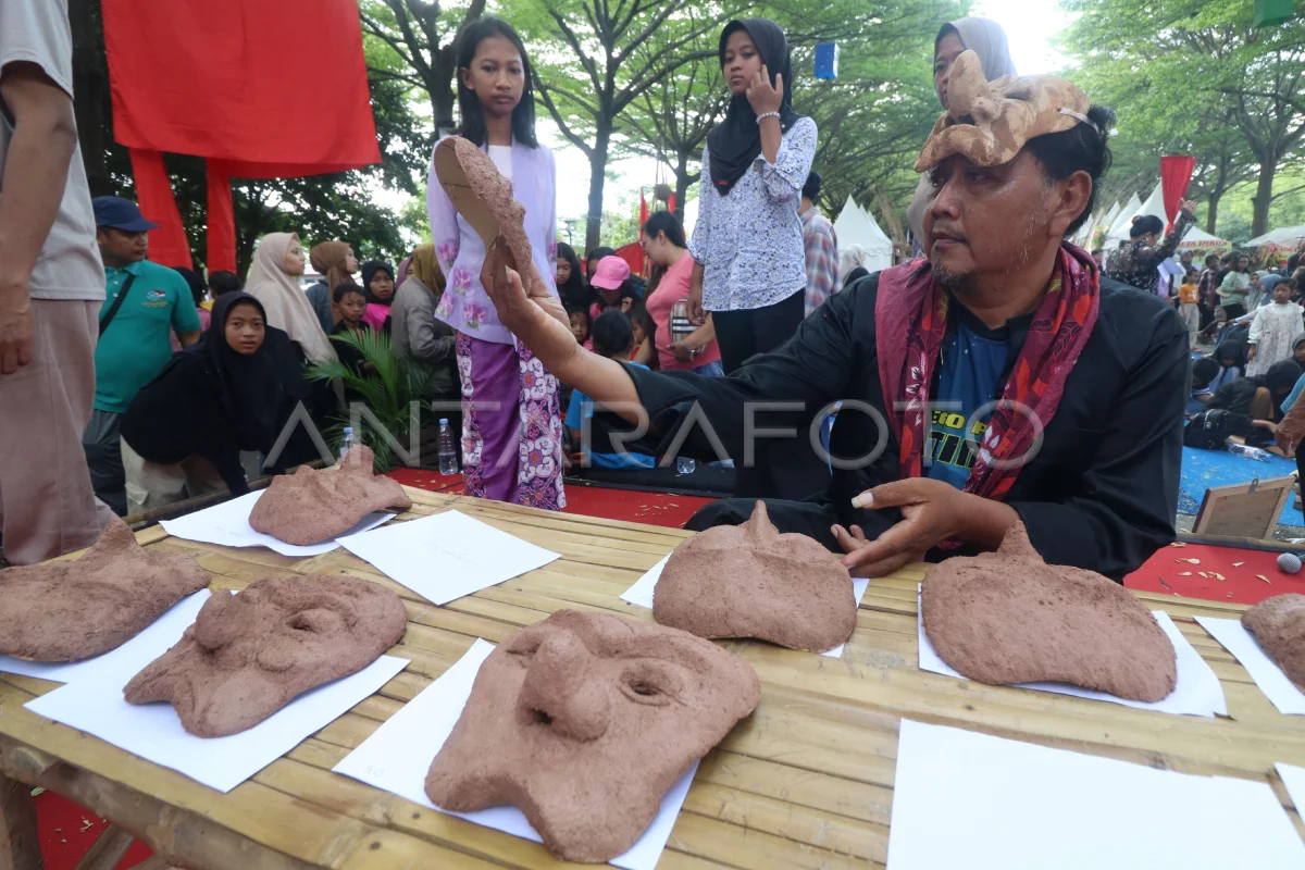 Panitia menata topeng karya peserta lokakarya pembuatan topeng dari serbuk kayu di Kabupaten Kediri, Jawa Timur, Minggu (25/5/2025). Lokakarya yang diselenggarakan pemerintah daerah setempat tersebut sebagai upaya memberi pengetahuan cara membuat topeng karakter panji ramah lingkungan sekaligus mengingatkan masyarakat bahwa Kediri sebagai Bumi Panji. ANTARA FOTO/Prasetia Fauzani/YU