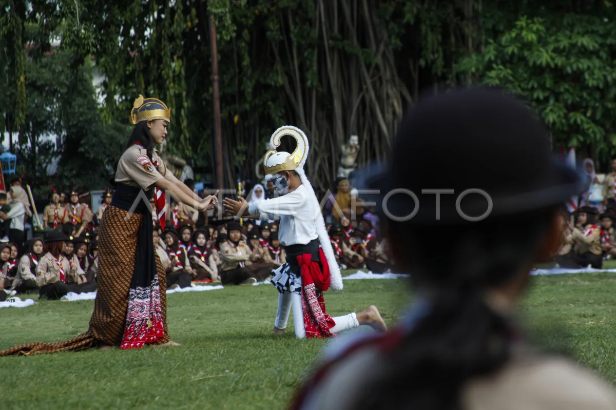 Sejumlah siswa menampilkan sendratari Anoman Obong pada acara Gelar Senja Pramuka di Lapangan Balai Kota Solo, Jawa Tengah, Senin (21/7/2025). Gelar Senja yang mengangkat tema Harmoni Langkah Pramuka Merajut Budaya Bangsa itu menampilkan beragam keterampilan anggota pramuka, ketangkasan, kesenian dan kebudayaan. ANTARAFOTO/Maulana Surya/YU