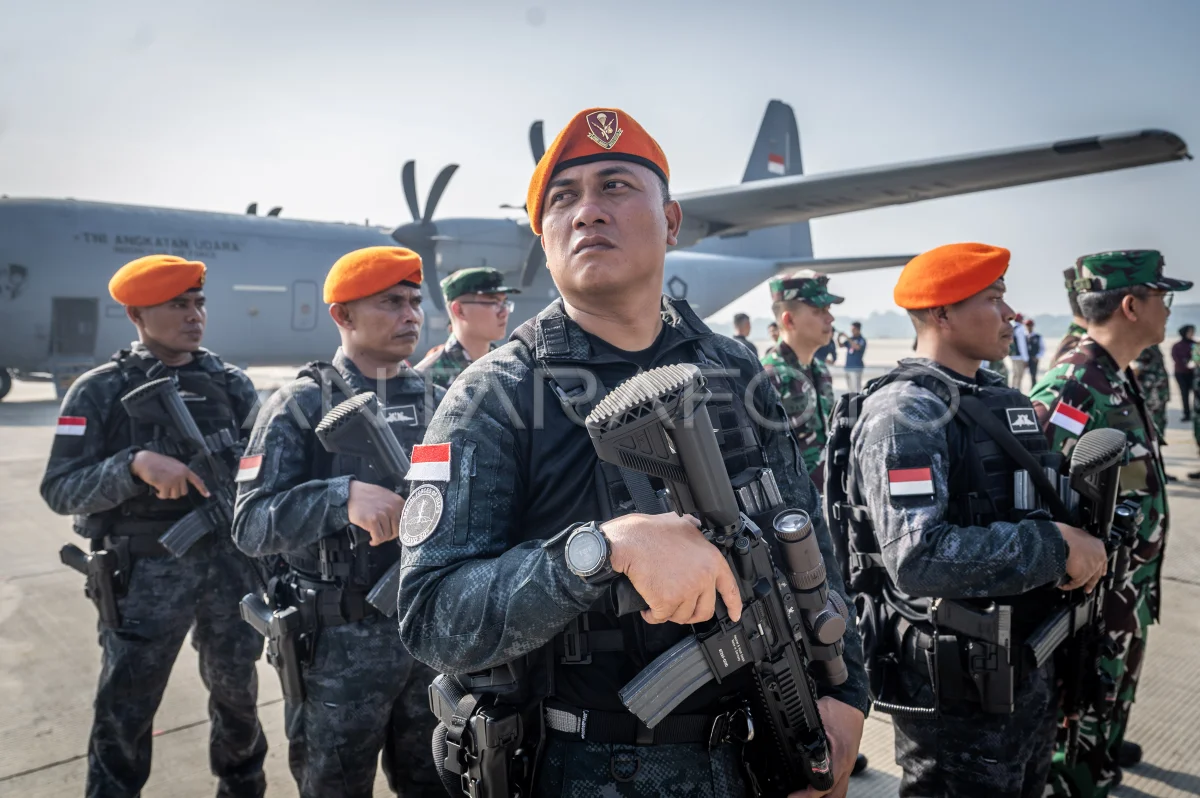 Prajurit TNI dari Komando Pasukan Gerak Cepat (Kopasgat) TNI AU mengikuti pelepasan Satuan tugas (Satgas) Merah Putih II untuk bantuan kemanusiaan ke Gaza di Lanud Halim Perdanakusuma, Jakarta, Rabu (13/8/2025). Pemerintah Indonesia mengirimkan 66 personel Satgas Merah Putih II yang terdiri dari TNI, Kementerian dan Lembaga serta perwakilan media nasional untuk memberikan bantuan sebanyak 800 ton berupa bahan makanan, obat-obatan, logistik sesuai kebutuhan. ANTARA FOTO/Bayu Pratama S/nz
