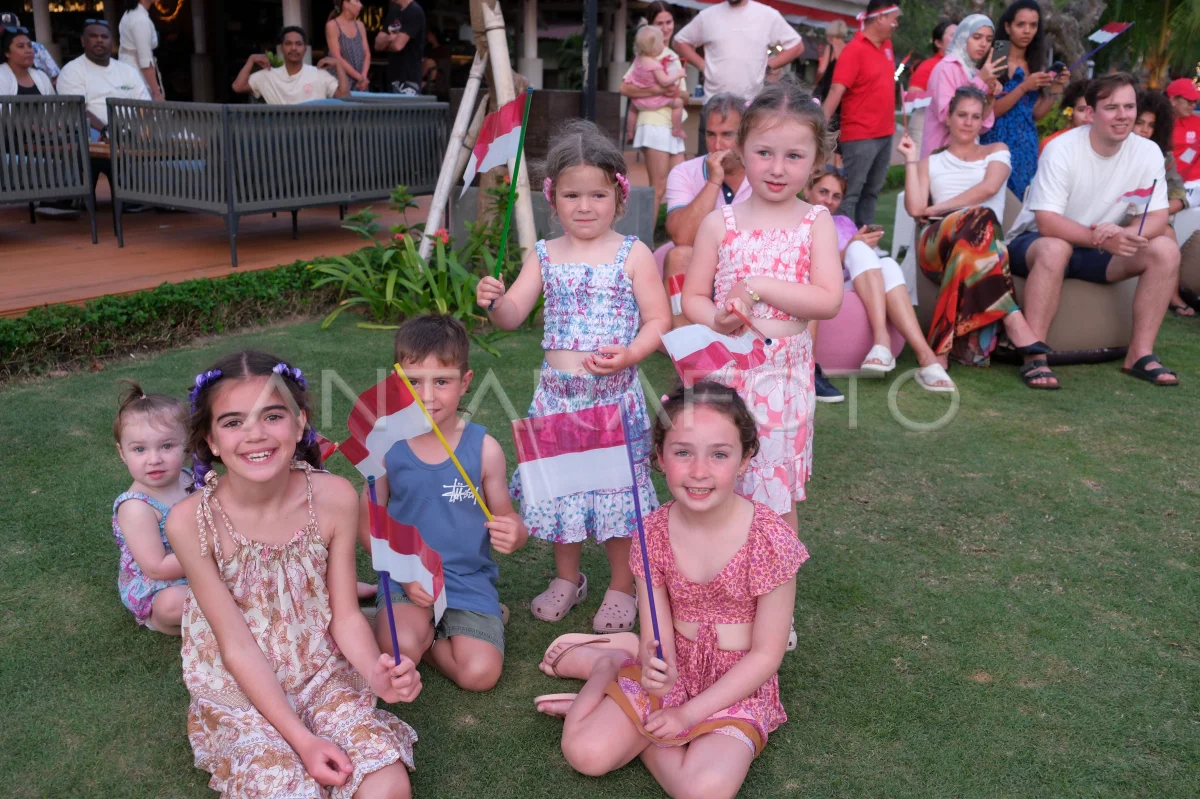 Wisatawan mancanegara membawa bendera Merah Putih saat menyaksikan Festival Satu Nusantara di Discovery Kartika Plaza Hotel, Kuta, Badung, Bali, Minggu (17/8/2025). Kegiatan yang menampilkan kekayaan budaya Indonesia melalui pertunjukan kolaboratif spesial tersebut untuk memperingati HUT ke-80 Kemerdekaan Republik Indonesia. ANTARA FOTO/Nyoman Hendra Wibowo/rwa.