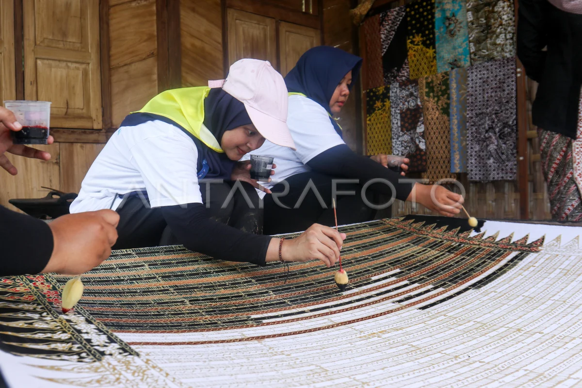 Peserta Qris Jelajah Budaya Indonesia (QJI) belajar membatik di Desa Wisata Adat Osing Kemiren, Banyuwangi, Jawa Timur, Selasa (19/8/2025). Melalui Program QJI 2025, Kantor Perwakilan Bank Indonesia Jember mengajak generasi muda menjelajahi ragam budaya dan destinasi wisata sambil mempromosikan kepada masyarakat agar beralih dari transaksi tunai ke-non tunai dengan memanfaatkan kemajuan teknologi. ANTARA FOTO/Budi Candra Setya/rwa.