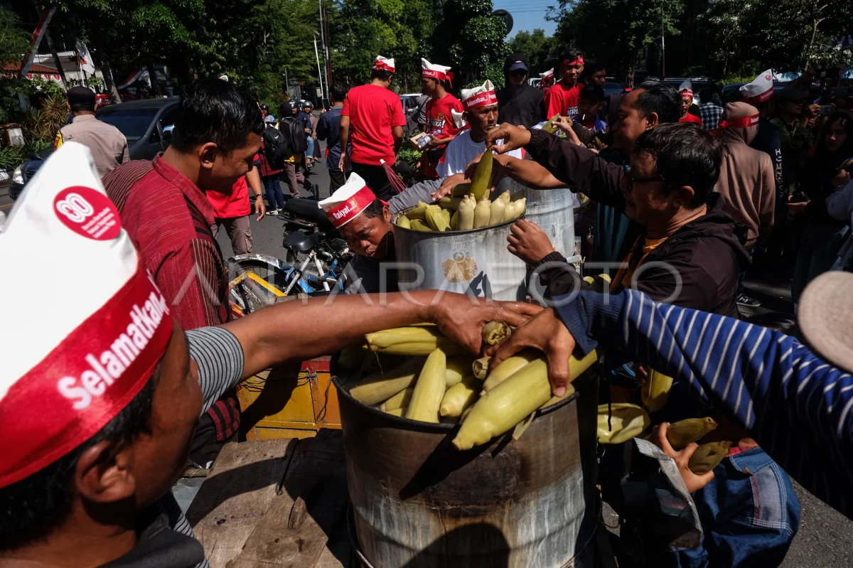 Anggota Peternak Ayam Rakyat Solo Raya membagikan jagung rebus saat aksi damai menyikapi harga jagung pakan ternak yang mahal di kawasan Gladak, Solo, Jawa Tengah, Selasa (26/8/2025). Dalam aksinya, mereka meminta agar pemerintah memberikan perlindungan bagi peternak. ANTARAFOTO/Maulana Surya/YU *** Local Caption ***