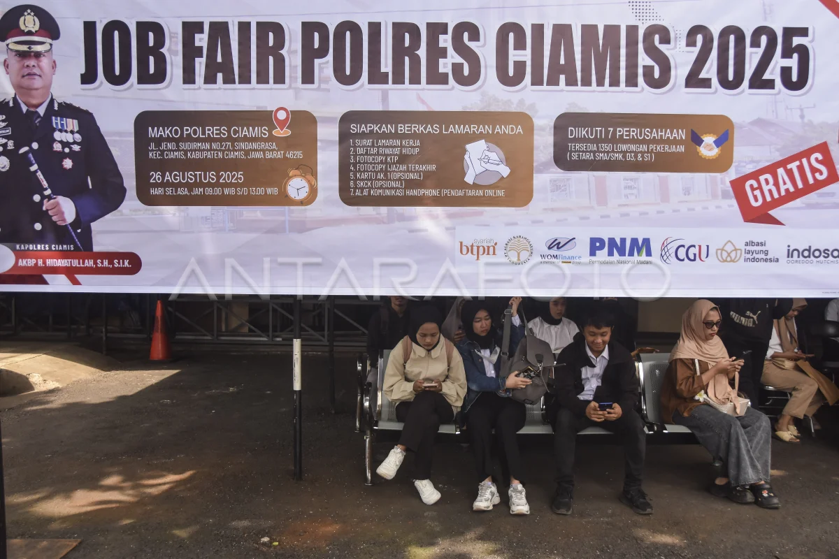 Sejumlah calon pelamar kerja antre saat melamar pekerjaan pada Job Fair di Mako Polres Ciamis, Kabupaten Ciamis, Jawa Barat, Selasa (26/8/2025). Polres Ciamis bekerjasama dengan enam perusahaan dari BUMN dan Swasta membuka kuota lowongan pekerjaan sebanyak 1.350 untuk mengurangi angka pengangguran sebanyak 22.000 orang sekaligus menurunkan angka kriminalitas. ANTARA FOTO/Adeng Bustomi/YU