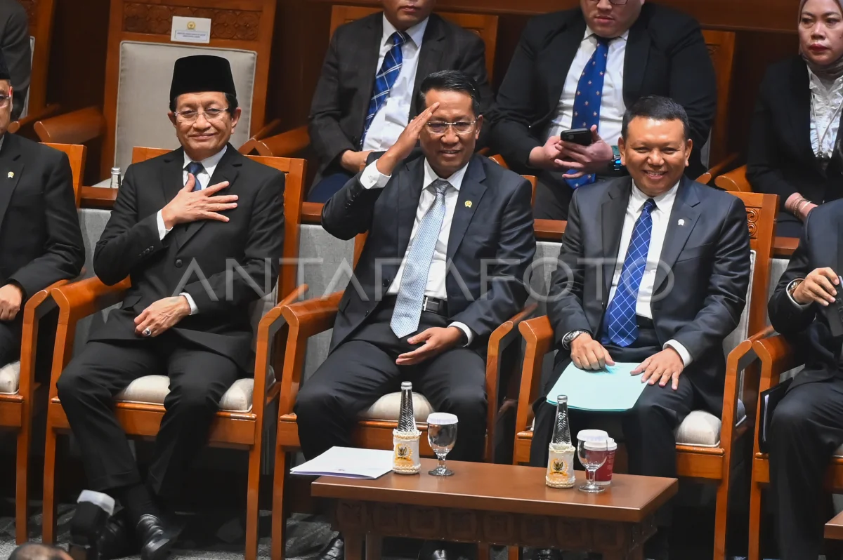 Menteri Hukum Supratman Andi Agtas (tengah) bersama Menteri Agama Nasaruddin Umar (kiri) dan Wamensesneg Bambang Eko Suhariyanto (kanan) bersiap mengikuti Rapat Paripurna ke-4 DPR RI Masa Sidang I Tahun Sidang 2025-2026 di Kompleks Parlemen, Senayan, Jakarta, Selasa (26/8/2025). Rapat tersebut menyetujui Rancangan Undang-Undang (RUU) tentang Perubahan Ketiga atas UU Nomor 8 Tahun 2019 tentang Penyelenggaraan Haji dan Umrah menjadi undang-undang, yang isinya membentuk Kementerian Haji dan Umrah serta persetujuan terhadap permohonan pertimbangan pemberian kewarganegaraan RI kepada sembilan atlet untuk memperkuat tim nasional RI di ajang internasional. ANTARA FOTO/Rivan Awal Lingga/YU