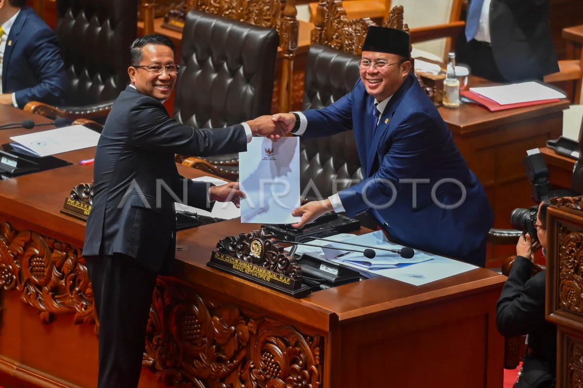 Wakil Ketua DPR Cucun Ahmad Syamsurijal (kanan) menerima laporan hasil pembahasan dari Menteri Hukum Supratman Andi Agtas (kiri) pada Rapat Paripurna ke-4 DPR RI Masa Sidang I Tahun Sidang 2025-2026 di Kompleks Parlemen, Senayan, Jakarta, Selasa (26/8/2025). Rapat tersebut menyetujui Rancangan Undang-Undang (RUU) tentang Perubahan Ketiga atas UU Nomor 8 Tahun 2019 tentang Penyelenggaraan Haji dan Umrah menjadi undang-undang, yang isinya membentuk Kementerian Haji dan Umrah serta persetujuan terhadap permohonan pertimbangan pemberian kewarganegaraan RI kepada sembilan atlet untuk memperkuat tim nasional RI di ajang internasional. ANTARA FOTO/Rivan Awal Lingga/YU
