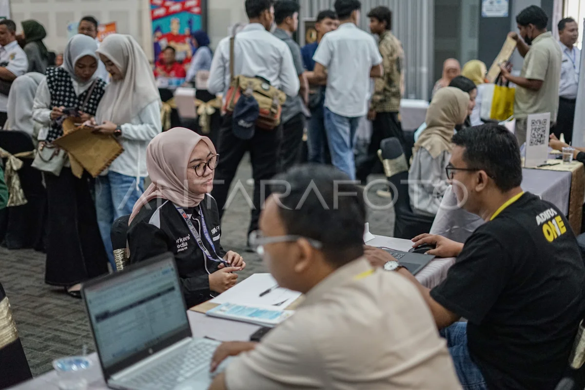 Penjaga stan perusahaan memberikan informasi kepada pencari kerja dalam acara Job Fair Kota Pekalongan 2025 di Kota Pekalongan, Jawa Tengah, Rabu (27/8/2025). Pemerintah Kota Pekalongan menggelar bursa kerja yang diikuti 42 perusahaan dengan terdapat 1.722 lowongan kerja bagi pencari kerja lulusan SMP, SMA/SMK, Diploma, Sarjana hingga Magister yang bertujuan untuk memperluas kesempatan kerja dan menekan angka pengangguran di Kota Pekalongan. ANTARA FOTO/Harviyan Perdana Putra/bar