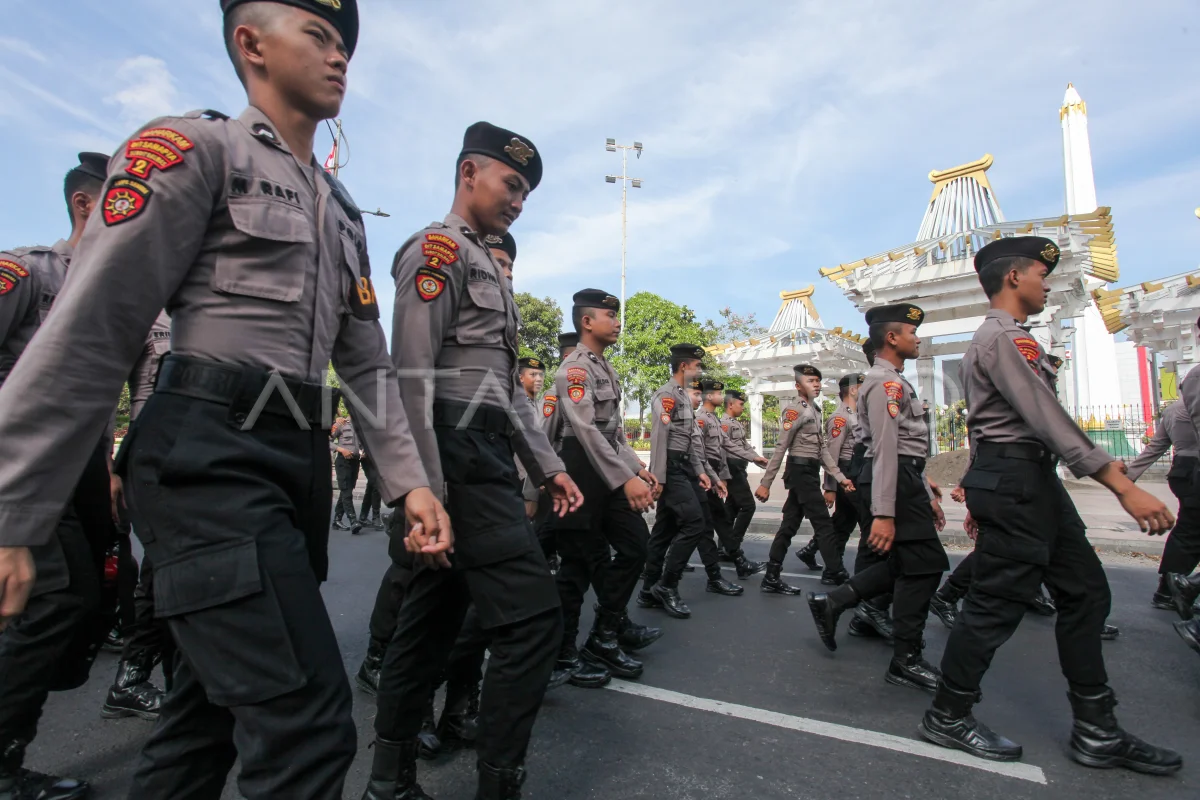 Sejumlah anggota Polri mengikuti apel pasukan pengamanan unjuk rasa buruh di Jalan Pahlawan, Surabaya, Jawa Timur, Kamis (28/8/2025). Polrestabes Surabaya mengerahkan sebanyak 2.608 anggota Polri untuk pengamanan tertutup maupun terbuka terkait unjuk rasa buruh di sejumlah lokasi di Surabaya. ANTARA FOTO/Didik Suhartono/rwa.