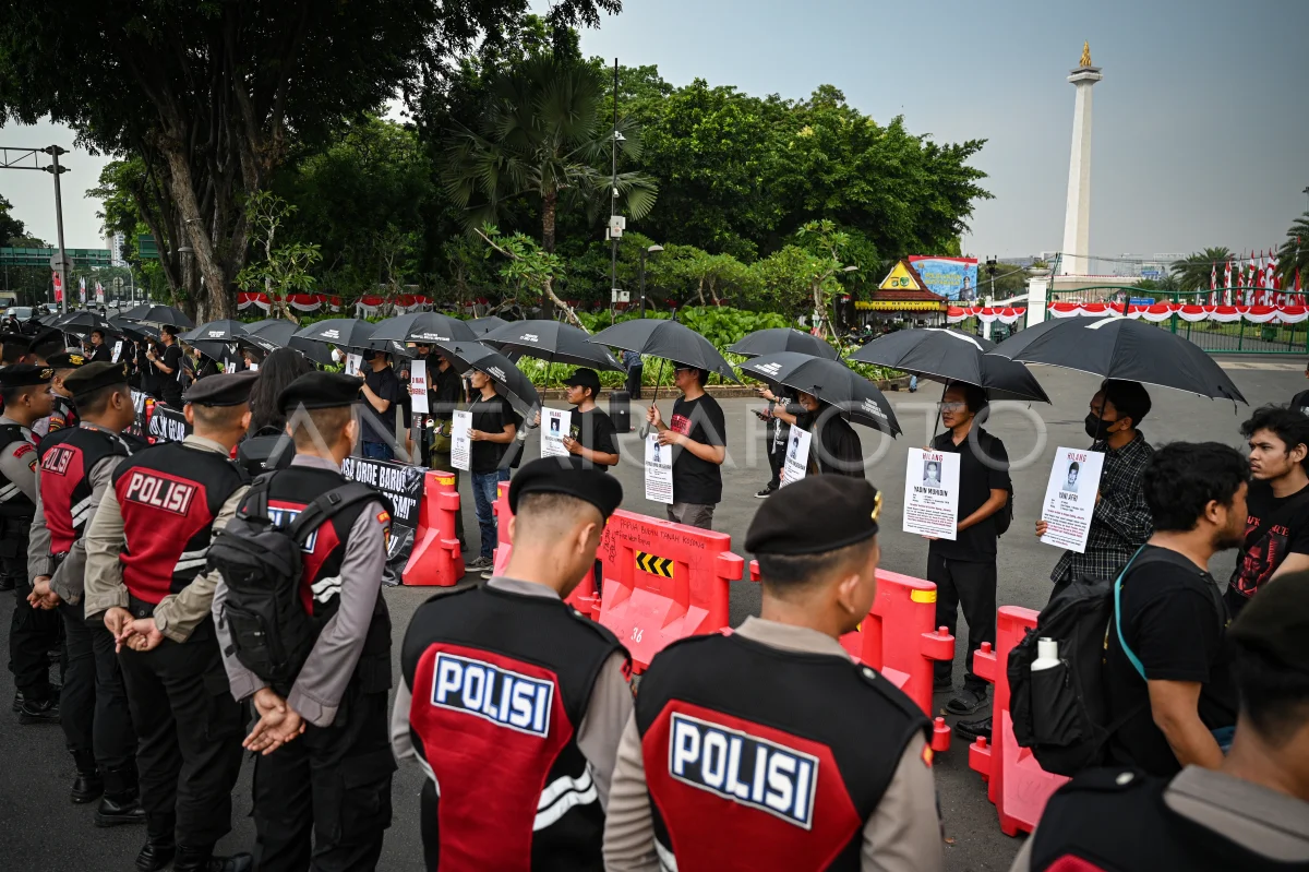 Aktivis Jaringan Solidaritas Korban untuk Keadilan mengikuti Aksi Kamisan ke-875 di depan Istana Merdeka, Jakarta, Kamis (28/8/2025). Aksi tersebut untuk memperingati Hari Anti Penghilangan Paksa Internasional sekaligus meminta pemerintah menghentikan proyek penulisan ulang sejarah nasional Indonesia dan meminta Jaksa Agung segera menindaklanjuti berkas penyelidikan Komnas HAM terkait kasus-kasus pelanggaran berat HAM dengan membentuk Tim Penvidik ad hoc sesuai mandat Pasal 21 ayat (3) UU No. 26/2000 tentang Pengadilan HAM. ANTARA FOTO/Fauzan/foc.