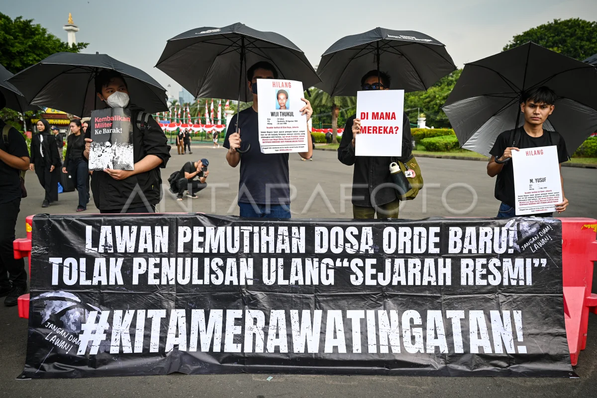 Aktivis Jaringan Solidaritas Korban untuk Keadilan mengikuti Aksi Kamisan ke-875 di depan Istana Merdeka, Jakarta, Kamis (28/8/2025). Aksi tersebut untuk memperingati Hari Anti Penghilangan Paksa Internasional sekaligus meminta pemerintah menghentikan proyek penulisan ulang sejarah nasional Indonesia dan meminta Jaksa Agung segera menindaklanjuti berkas penyelidikan Komnas HAM terkait kasus-kasus pelanggaran berat HAM dengan membentuk Tim Penvidik ad hoc sesuai mandat Pasal 21 ayat (3) UU No. 26/2000 tentang Pengadilan HAM. ANTARA FOTO/Fauzan/foc.