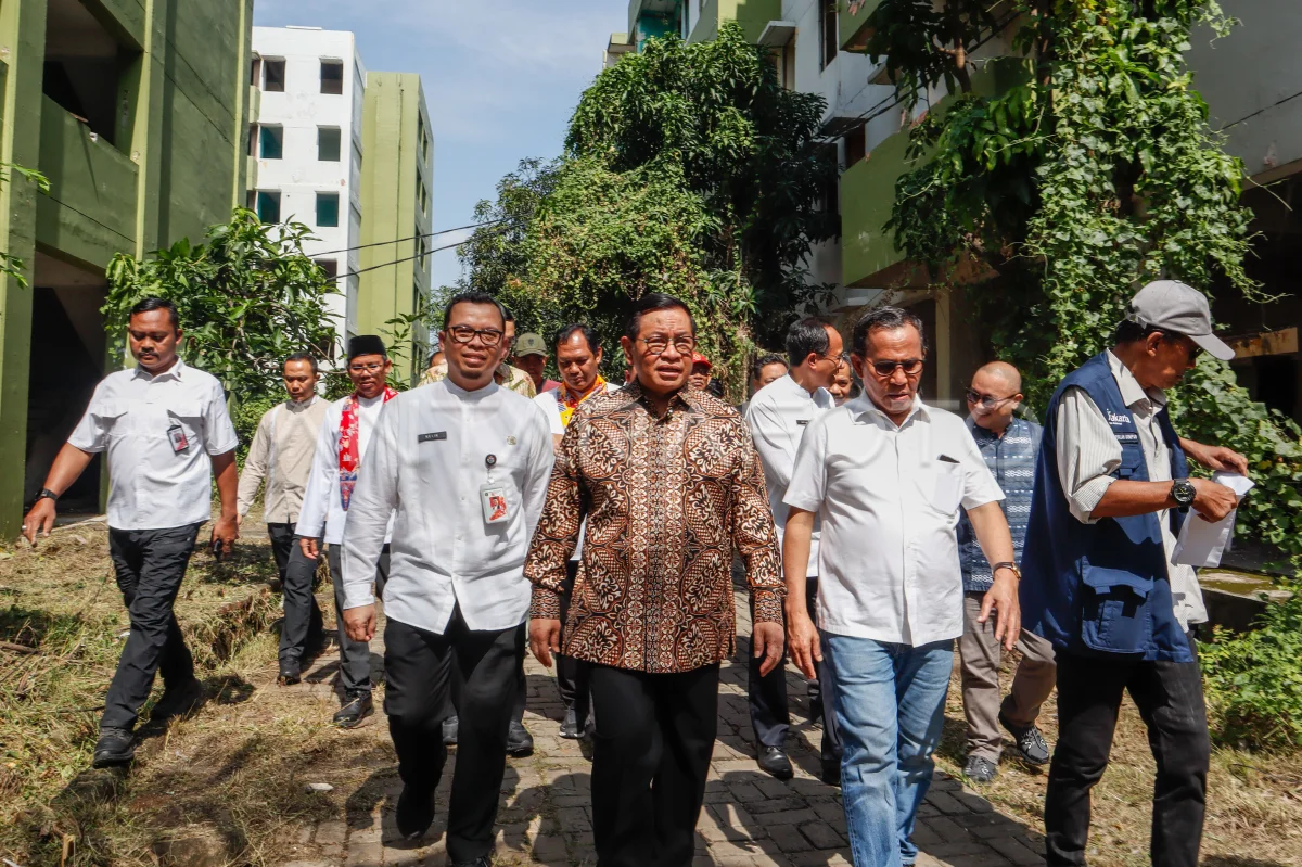 Gubernur DKI Jakarta Pramono Anung (tengah) meninjau bangunan di Rusunawa Marunda kluster C, Jakarta, Jumat (29/8/2025). Pemprov DKI Jakarta berencana merevitalisasi rusun yang terdiri dari lima tower dengan 500 unit hunian dan terbengkalai sejak September 2023 tersebut sebagai upaya penyediaan hunian layak bagi masyarakat. ANTARAFOTO/Muhammad Rizky Febriansyah/nym.