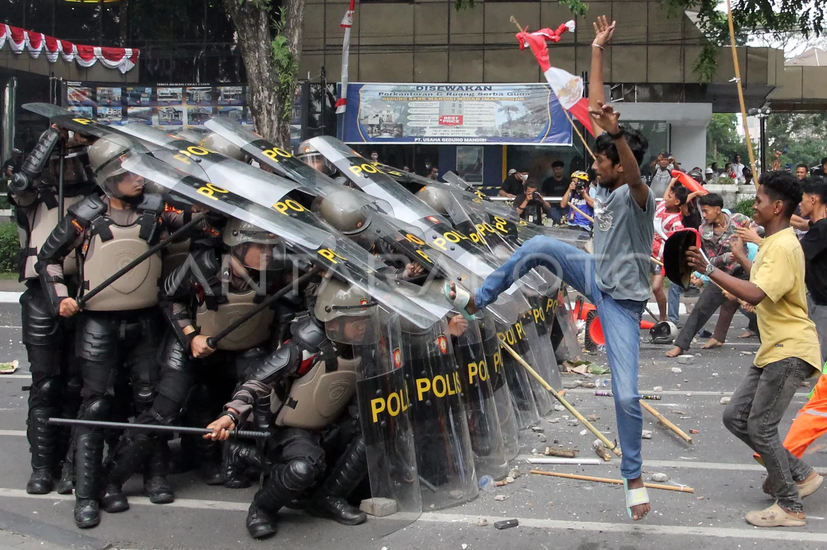 Pengunjuk rasa menendang petugas saat aksi di depan Gedung DPRD Sumatera Utara, Medan, Jumat (29/8/2025). ANTARA FOTO/Yudi Manar/rwa.