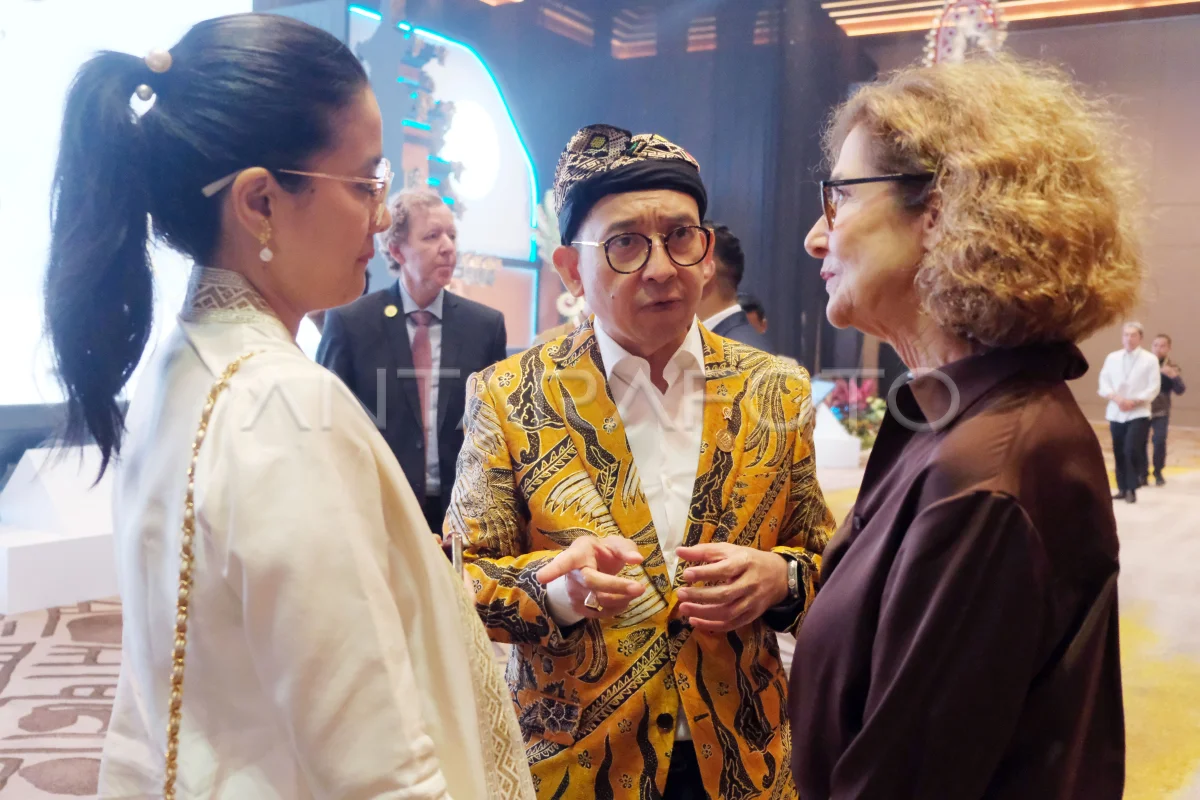 Menteri Kebudayaan Fadli Zon (tengah) berbincang dengan Aktris Marcella Zalianty (kiri) dan delegasi negara peserta saat penutupan konferensi budaya internasional Culture, Heritage, Art, Narrative, Diplomacy, and Innovation (CHANDI) 2025 di Sanur, Denpasar, Bali, Rabu (3/9/2025). Menteri Kebudayaan Fadli Zon mengatakan di akhir forum internasional CHANDI 2025 lahir sebuah deklarasi bersama yang dinamakan Bali Cultural Initiative Declaration atau Deklarasi Inisiatif Budaya Bali yaitu menyoroti budaya sebagai pilar pembangunan berkelanjutan dan ketahanan terhadap perubahan iklim, menekankan integrasi ke dalam strategi nasional dan pemanfaatan pengetahuan tradisional untuk keanekaragaman hayati dan adaptasi masyarakat, serta menegaskan kembali diplomasi budaya sebagai jembatan menuju perdamaian, dialog, dan saling pengertian. ANTARA FOTO/Nyoman Hendra Wibowo/tom.