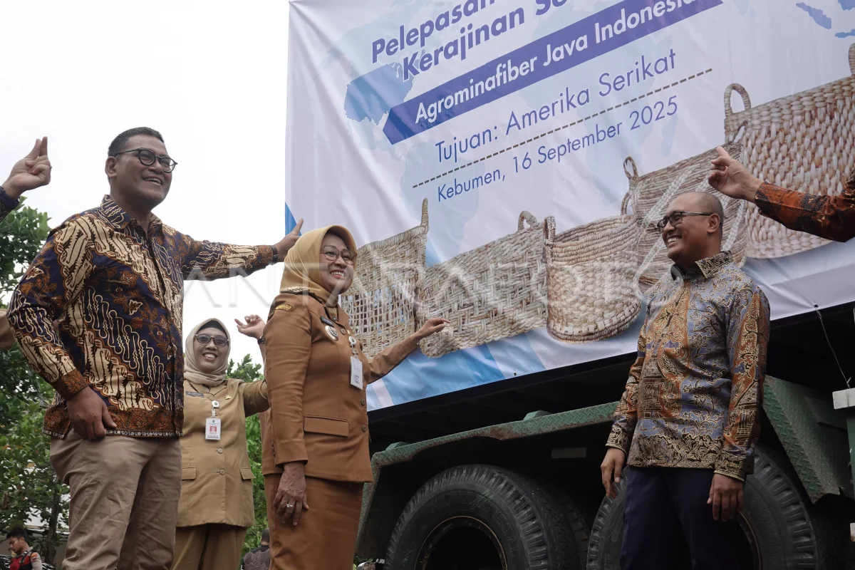 VP CSR & SMEPP PT Pertamina Persero Rudi Ariffianto (kanan) bersama Presdir Pertamina Foundation Agus Mashud (kiri) dan Bupati Kebumen Lilis Nuryani (tengah) secara simbolis melepas ekspor perdana kerajinan serat alam di Gedung PLUT Kebumen, Jawa Tengah, Selasa (16/9/2025). PT Agrominafiber Java Indonesia yang merupakan mitra binaan PT Pertamina Persero melalui program Patrapreneur Agregator melakukan ekspor perdana 9.635 produk kerajinan dari serat pelepah pisang dan eceng gondok ke Ameria Serikat senilai 934 juta rupiah yang melibatkan 70 perajin bahan baku dan 300 mitra perajin produk di wilayah Semarang, Kebumen, dan Cilacap. ANTARA FOTO/Idhad Zakaria/tom.