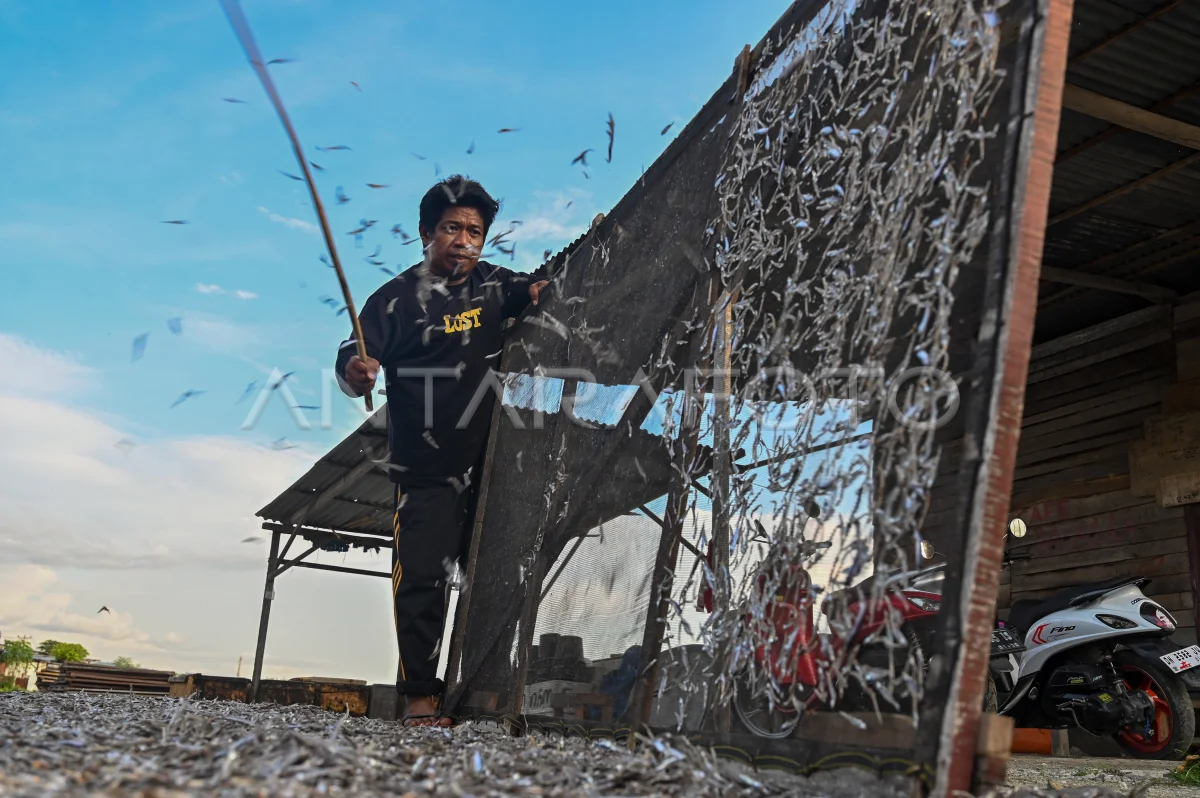 Pekerja merontokkan ikan kering jenis teri dari wadah pengeringan di Kelurahan Mamboro Barat, Palu, Sulawesi Tengah, Rabu (17/9/2025). Intensitas hujan yang cukup sering di wilayah itu membuat pengeringan ikan terhambat dan mengerek harganya dari rata-rata Rp40 ribu per kilogram menjadi Rp50 ribu per kilogram. ANTARA FOTO/Basri Marzuki/aww.