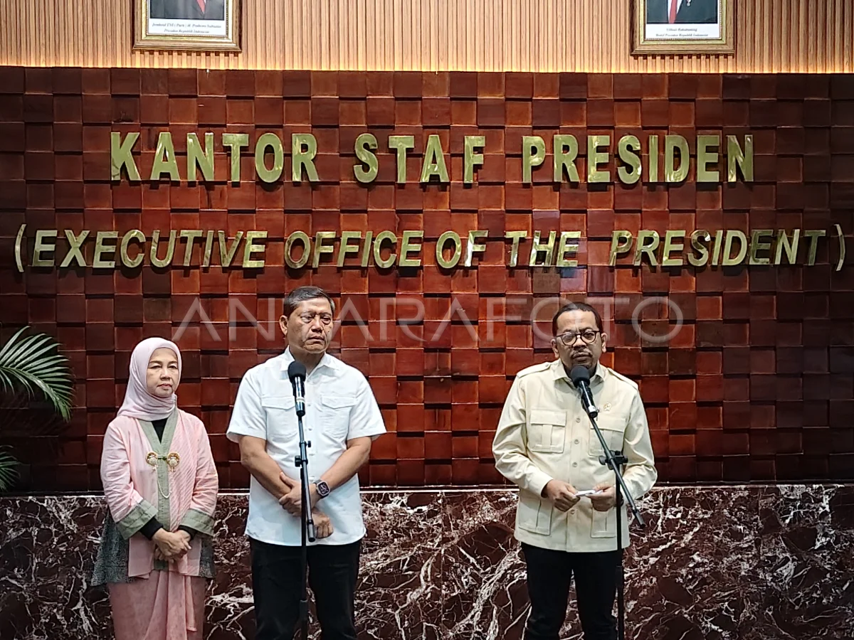 Kepala Staf Kepresidenan Muhammad Qodari (kanan) bersama mantan Kepala Staf Kepresidenan AM Putranto (tengah) memberikan sambutannya pada acara serah terima jabatan kepala KSP di Gedung Bina Graha, Kompleks Istana Kepresidenan, Jakarta, Kamis (18/9/2025). Pengamat politik dan peneliti Indonesia M Qodari resmi menjadi Kepala Staf Kepresidenan usai dilantik Presiden Prabowo Subianto di Istana Negara, Rabu (17/9/2025). ANTARA FOTO/Fathur Rochman/Adm/YU