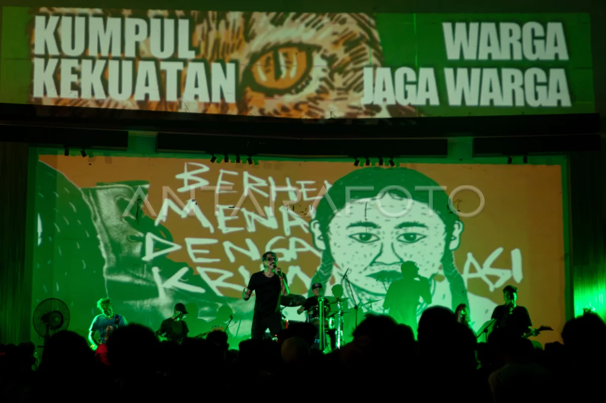 Vokalis Band Majelis Lidah Berduri, Ugoran Prasad memainkan lagu saat pementasan musik bertajuk Kumpul Kekuatan September Hitam di Auditorium Imam Bardjo Universitas Diponegoro Semarang, Jawa Tengah, Sabtu (20/9/2025) malam. Kegiatan pementasan seni kolaborasi yang diinisasi Maring Institut, Aksi Kamisan Semarang, LBH Semarang, Bara Puan dan sejumlah seniman serta organisasi mahasiswa itu menyoroti rangkaian peristiwa pelanggaran Hak Asasi Manusia (HAM) yang terjadi di Indonesia yaitu dari kasus G30S PKI 1965, tragedi Tanjung Priok 1984, tragedi 1998, pembunuhan Munir 2004, aksi #ReformasiDikorupsi 2019, aksi unjuk rasa Agustus 2025 dan juga isu lingkungan dan perempuan yang dinilai masih menjadi pekerjaan rumah bagi pemerintah Indonesia. ANTARA FOTO/Aji Styawan/bar