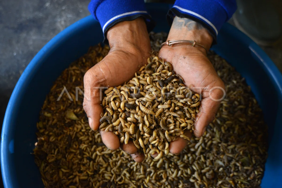 Petugas Lembaga Pengelola Sampah (LPS) menunjukkan maggot sebagai pengurai sampah organik di Rumah Kreatif LPS Parupuk Tabing, Padang, Sumatera Barat, Minggu (21/9/2025). LPS Parupuk Tabing mengolah sampah organik melalui budidaya maggot, larva dari lalat Black Soldier Fly (BSF) yang membuat produksi sampah berkurang hingga 30 persen. ANTARA FOTO/Iggoy el Fitra/bar