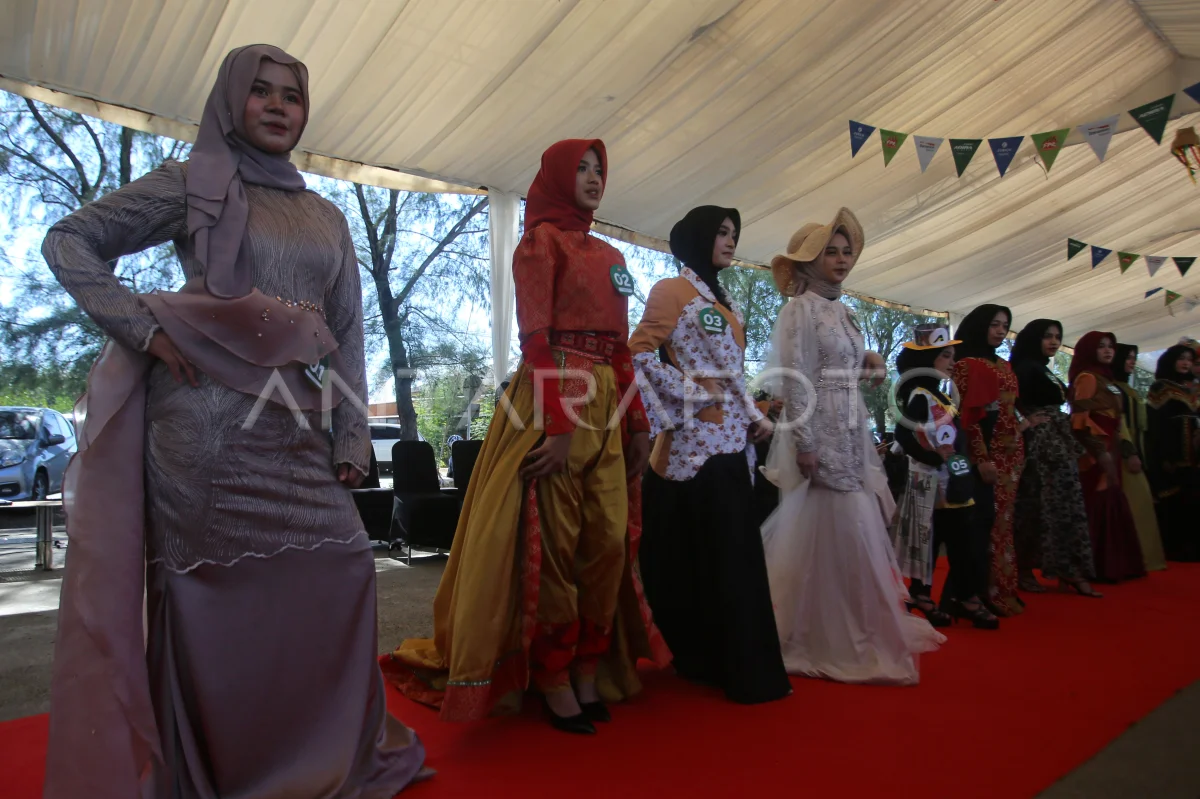 Para model memperagakan busana muslim pada tahap penjurian di Festival Pasar Rakyat, Banda Aceh, Aceh, Minggu (21/9/2025). Kegiatan perlombaan peragaan busana muslim pada Festival Pasar Rakyat itu bertujuan mendorong perkembangan usaha industri fesyen muslim, pelestarian budaya syariah dan menjadi pusat pasar sebagai ruang kreatif meningkat perekonomian masyarakat. ANTARA FOTO/Ampelsa/bar