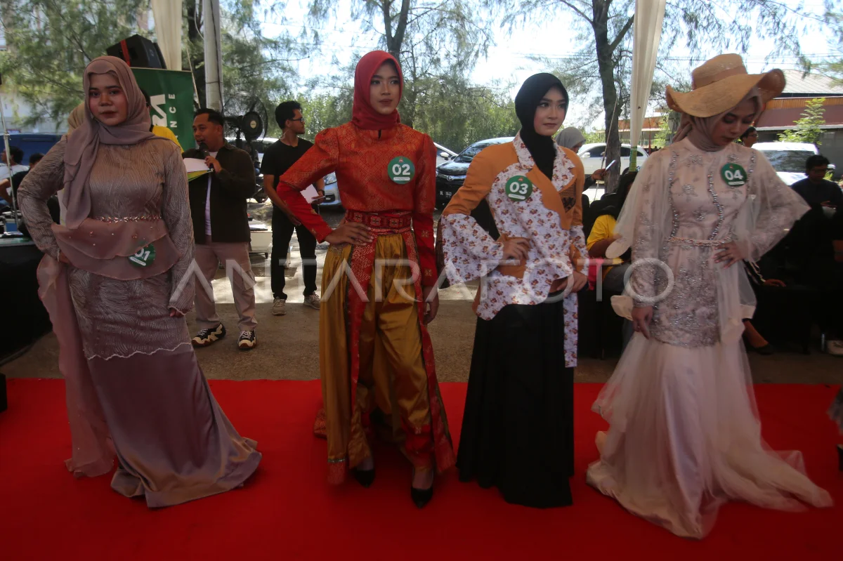 Para model memperagakan busana muslim pada tahap penjurian di Festival Pasar Rakyat, Banda Aceh, Aceh, Minggu (21/9/2025). Kegiatan perlombaan peragaan busana muslim pada Festival Pasar Rakyat itu bertujuan mendorong perkembangan usaha industri fesyen muslim, pelestarian budaya syariah dan menjadi pusat pasar sebagai ruang kreatif meningkat perekonomian masyarakat. ANTARA FOTO/Ampelsa/bar