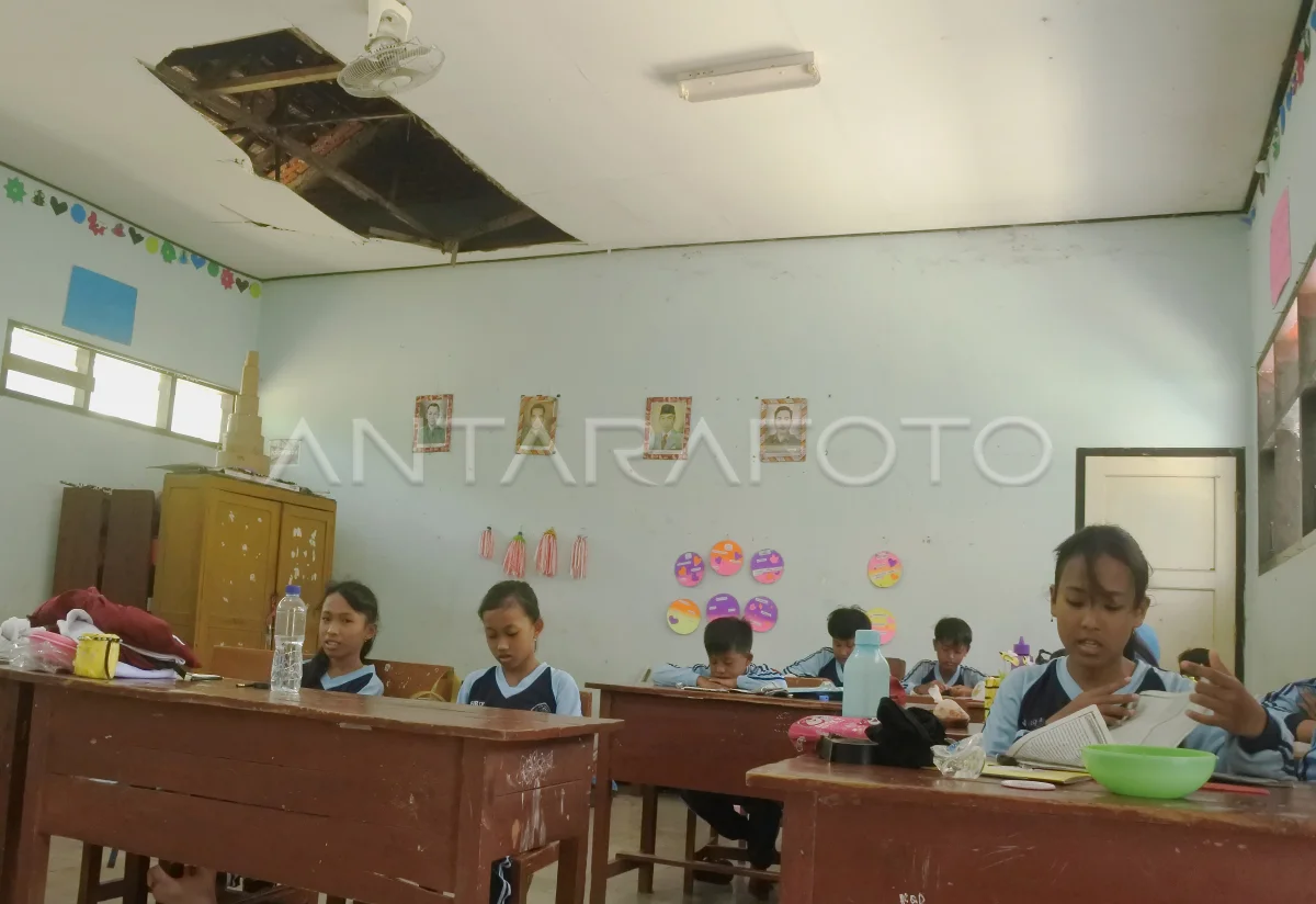 Sejumlah siswa belajar di ruang kelas SDN 2 Bugeman, Desa Bugeman, Kendit, Situbondo, Jawa Timur, Senin (22/9/2025). Siswa kelas V dan VI di sekolah tersebut terpaksa belajar di ruang kelas yang rusak selama enam tahun terakhir ini dan hingga kini belum ada perbaikan. ANTARA FOTO/Seno/rwa.