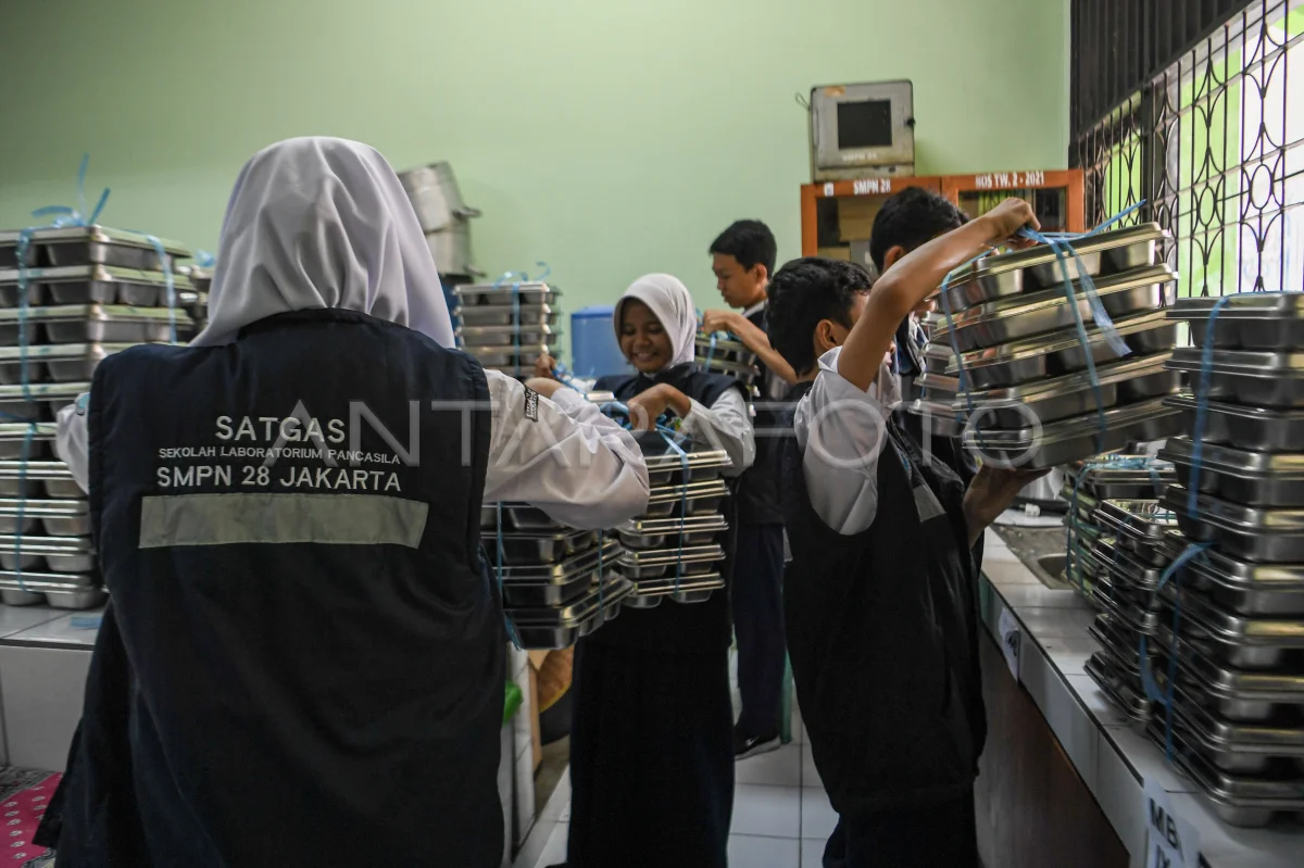Siswa Satgas Sekolah Laboratorium Pancasila (SLP) membawa tempat makan program MBG di SMPN 28 Johar Baru, Jakarta, Selasa (23/9/2025). Pemprov DKI Jakarta membuat inovasi Sekolah Laboratorium Pancasila (SLP) untuk meningkatkan pemahaman nilai-nilai karakter bangsa pada Guru dan pelajar, serta untuk menangkal degradasi moral remaja. ANTARA FOTO/Muhammad Adimaja/bar