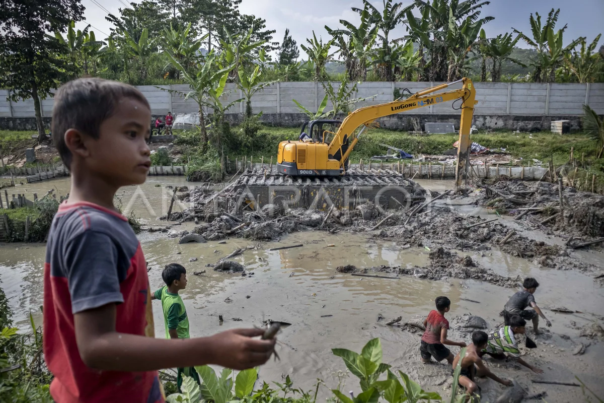 Petugas menggunakan eskavator melakukan pengerukan sedimentasi di Situ Ciburuy, Padalarang, Kabupaten Bandung Barat, Jawa Barat, Selasa (23/9/2025). Pemerintah Provinsi Jawa Barat akan menyewakan rumah sementara selama setahun untuk warga yang rumah atau tempat usahanya dibongkar di kawasan Situ Ciburuy untuk keperluan revitalisasi sebagai upaya untuk mengembalikan fungsi ekologis dan daya tampung air situ. ANTARA FOTO/Abdan Syakura