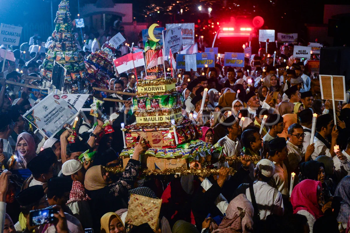 Warga berebut gunungan makanan ringan saat pembukaan Festival Maulid Nusantara 2 di Taman Elektrik, Kota Tangerang, Banten, Selasa (23/9/2025). Kegiatan yang berlangsung pada 23 - 28 September 2025 dalam rangka memeriahkan peringatan Hari Maulid Nabi Muhammad SAW tersebut guna melestarikan budaya dan tradisi Islam. ANTARA FOTO/Putra M. Akbar/foc.