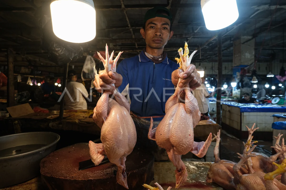 Pedagang menunjukkan daging ayam yang dijual di Pasar Korem, Kendari, Sulawesi Tenggara, Rabu (24/9/2025). Kementerian Pertanian berupaya mengendalikan harga daging ayam yang naik pada September 2025 dari Rp36 ribu per kilogram menjadi Rp38 ribu ribu per kilogram dengan membantu distribusi ayam ke berbagai daerah serta mengawasi penetapan harga dikonsumen bersama asosiasi perunggasan dan pemerintah daerah agar tetap menguntungkan peternak dan tidak membebani konsumen. ANTARA FOTO/Andry Denisah/tom.