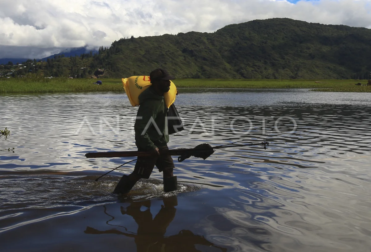 Seorang warga melintas di sekitar pinggiran Danau Paniai di Kampung Kogekotu, Kecamatan Paniai Timuri, Kabupaten Paniai, Provinsi Papua Tengah, Rabu (24/9/2025). Air Danau Paniai meluap menggenangi pinggiran danau setinggi 40- 60 cm akibat curah hujan yang cukup tinggi di wilayah itu. ANTARA FOTO/Gusti Tanati/nz