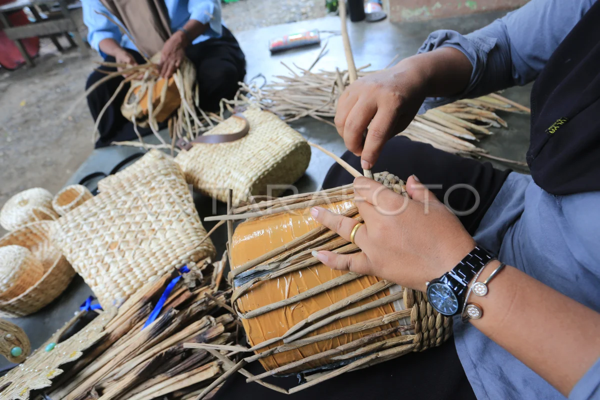 Perajin menyelesaikan pembuatan kerajinan tas berbahan baku tanaman eceng gondok (Eichornia crassipes) di Desa Kubu, Arogan Lambalek, Aceh Barat, Aceh, Rabu (24/9/2025). Permintaan berbagai jenis kerajinan dan aksesoris berbahan baku enceng gondok seperti keranjang, kotak tisu, alas piring, alas gelas, nampan, tempat permen, tas, vas bunga dan kotak gelas sejak beberapa bulan terakhir mengalami peningkatan dari 150 kerajinan per bulan menjadi 200 hingga 320 produk kerajinan per sekali pengiriman ke Bali, Medan, Padang dan Johor Malaysia karena nilai keunikan dan tren penggunaan produk ramah lingkungan. ANTARA FOTO/Syifa Yulinnas/nz