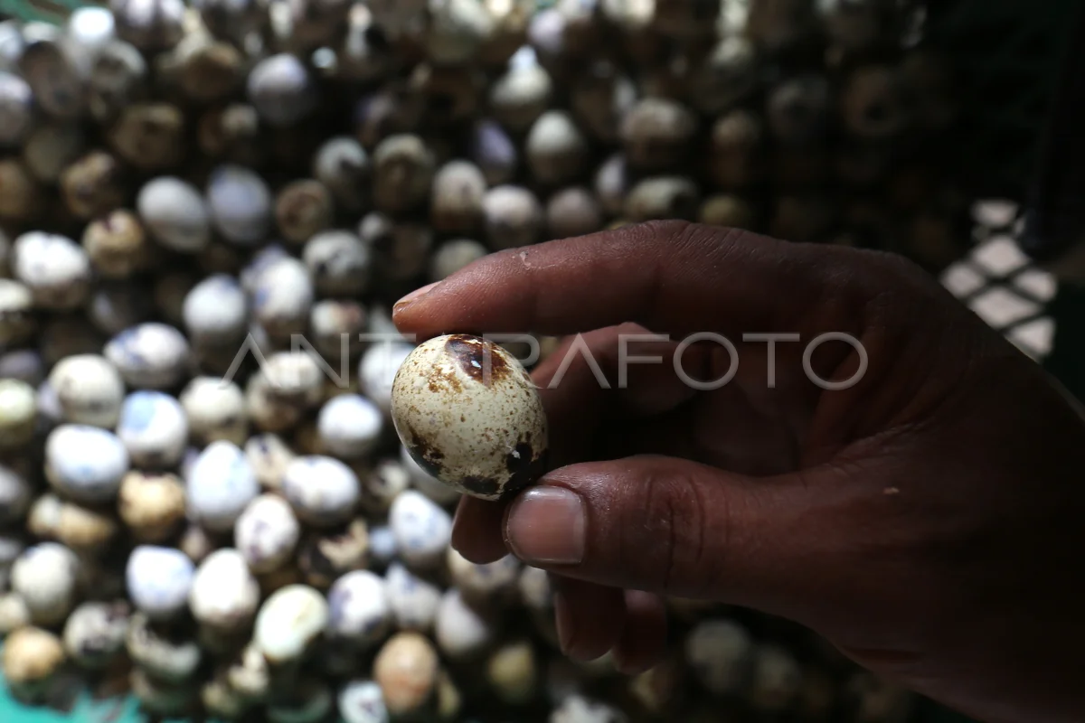 Anggota kelompok usaha peternakan puyuh Lampoh Kutam memperlihatkan telur puyuh di Aceh Besar, Aceh, Kamis (25/9/2025). Kelompok usaha peternakan puyuh binaan PT Semen Indonesia (Persero) Tbk itu mampu memproduksi sekitar 4.000 butir telur puyuh per hari yang didistribusikan ke pasar tradisional dan supermarket serta memenuhi kebutuhan pangan program makan bergizi gratis (MBG) di Kota Banda Aceh dan Kabupaten Aceh Besar. ANTARA FOTO/Irwansyah Putra/agr
