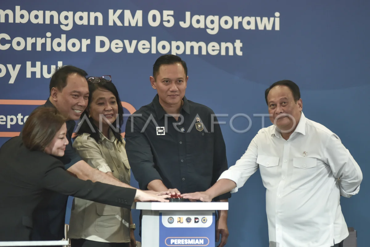 Menko Bidang Infrastruktur dan Pembangunan Kewilayahan Agus Harimurti Yudhoyono (AHY) (kedua kanan) didampingi Wamen Pekerjaan Umum Diana Kusumastuti (ketiga kiri), Wamenhub Suntana (kanan), Direktur Utama Jasa Marga Rivan Achmad Purwantono (kedua kiri), dan Managing Director Danantara Febriany Eddy (kiri) menekan tombol saat seremonial peresmian Travoy Hub di Taman Mini, Jakarta Timur, Kamis (25/9/2025). Pemerintah bersama PT Jasa Marga Tbk (Persero) membangun Toll Corridor Development (TCD) Taman Mini atau Travoy Hub tahap 1 sebagai tempat pemberhentian yang mengintegrasikan antarmoda transportasi seperti LRT Jabodebek, bus Transjakarta, Jak Lingko, dan pengguna jalan Tol Jagorawi. ANTARA FOTO/Fakhri Hermansyah/tom.