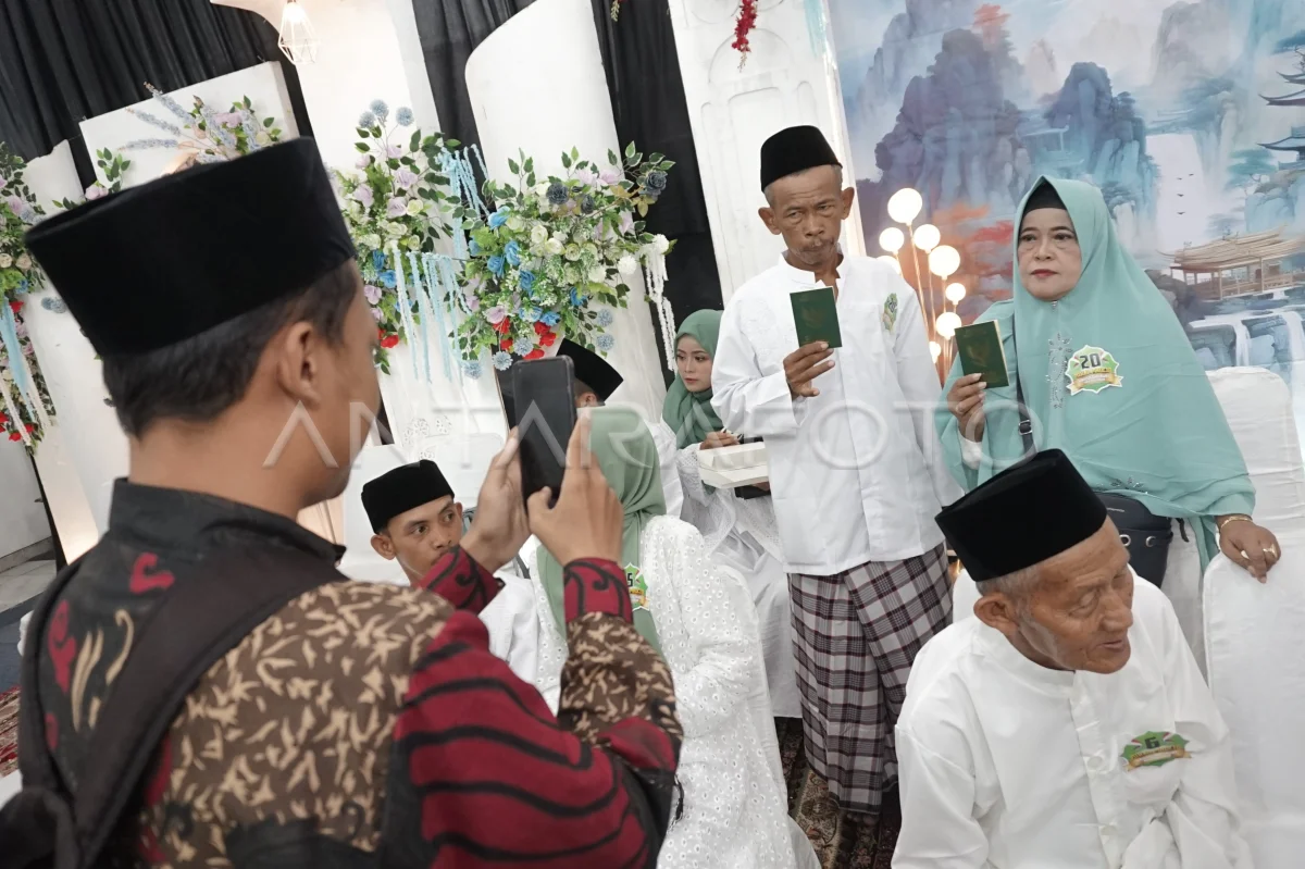 Seorang warga mengabadikan foto pasangan nikah dengan menunjukkan buku nikah saat mengikuti nikah Maulid secara massal di Gedung Kanzus Sholawat, Kota Pekalongan, Jawa Tengah, Jumat (26/9/2025). Nikah massal yang diselenggarakan oleh Majelis Kanzus Sholawat itu dalam rangka memperingati Maulid Nabi Muhammad SAW 1447 H/2025 yang diikuti 20 pasangan pengantin. ANTARA FOTO/Harviyan Perdana Putra/foc.