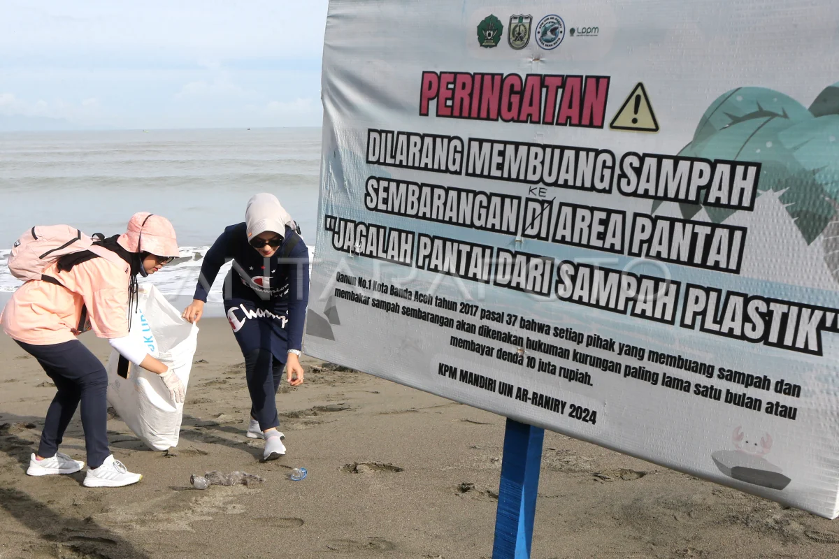 Aktivis lingkungan (kiri) bersama pegawai Pemkot Banda Aceh memungut sampah plastik di pantai wisata Syiah Kuala, Banda Aceh, Aceh, Sabtu (27/9/2025). Aksi membersihkan pantai, taman wisata, taman kota dan sungai yang melibatkan mahasiswa, pelajar, aktivis peduli lingkungan dan ribuan ASN Pemerintah Aceh serta pagawai Pemkot Banda Aceh itu merupakan rangkaian kegiatan memperingati hari bersih-bersih sedunia (World Cleanup Day) dan aksi menuju Indonesia bersih 2029. ANTARA FOTO/Irwansyah Putra/nz.