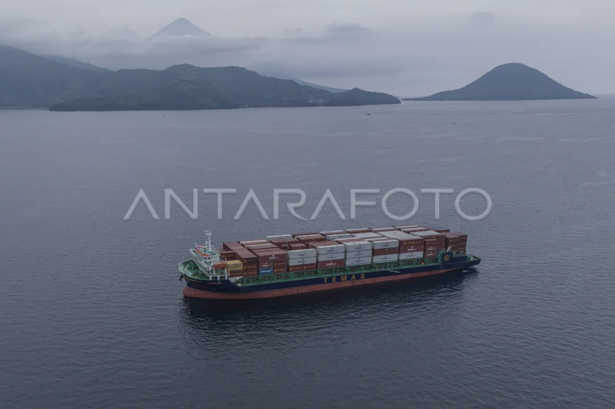 Foto udara kapal mengangkut peti kemas saat lego jangkar di perairan Ternate, Maluku Utara, Sabtu (27/9/2025). Kementerian Keuangan menyebut neraca perdagangan Indonesia pada Agustus 2025 surplus 5,3 miliar dolar AS lebih tinggi dibandingkan Juli yang surplus 4,17 miliar dolar AS dan hal tersebut dipengaruhi dari langkah para eksportir melakukan pengiriman barang lebih dulu untuk menghindari tarif impor AS yang diterapkan 7 Agustus 2025 lalu. ANTARA FOTO/Andri Saputra/sgd