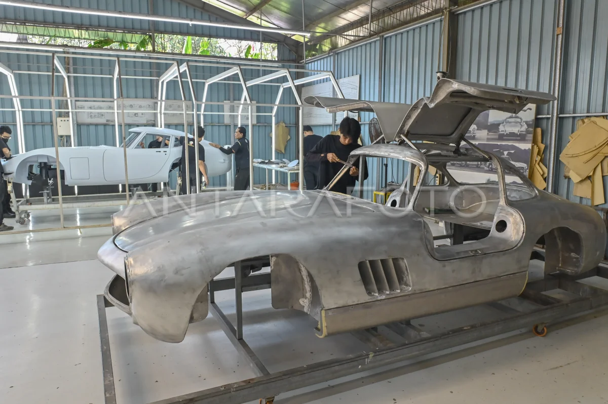 Pekerja melakukan proses produksi replika mobil klasik di Tuksedo Studio, Gianyar, Bali, Sabtu (27/9/2025). Tuksedo Studio yang memproduksi sejumlah tipe replika mobil klasik buatan tangan dengan harga berkisar Rp2 miliar hingga Rp5 miliar per unit tersebut terus mengembangkan produk-produk kreasinya sebagai salah satu upaya untuk mendukung peningkatan sektor industri dan ekonomi kreatif di Indonesia. ANTARA FOTO/Fikri Yusuf/sgd