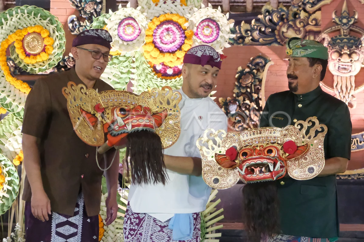 Wakil Menteri Kebudayaan Giring Ganesha (tengah) didampingi Direktur Warisan Budaya, Direktorat Jenderal Pelindungan Kebudayaan dan Tradisi, Kementerian Kebudayaan I Made Dharma Suteja (kiri) berbincang dengan Ida Cokorda Mengwi XIII saat pembukaan Taman Ayun Barong Festival 2025 di Pura Taman Ayun, Badung, Bali, Sabtu (27/9/2025). Festival tahunan yang digelar pada 27-28 September 2025 tersebut dibagi menjadi dua kategori yakni regeneration atau anak dengan diikuti 21 penari barong buntut dan pemain kendang khas Bali, kemudian kategori superstar atau profesional yang diikuti 10 kelompok tari barong ket sebagai pelestarian budaya Bali. ANTARA FOTO/Nyoman Hendra Wibowo/sgd