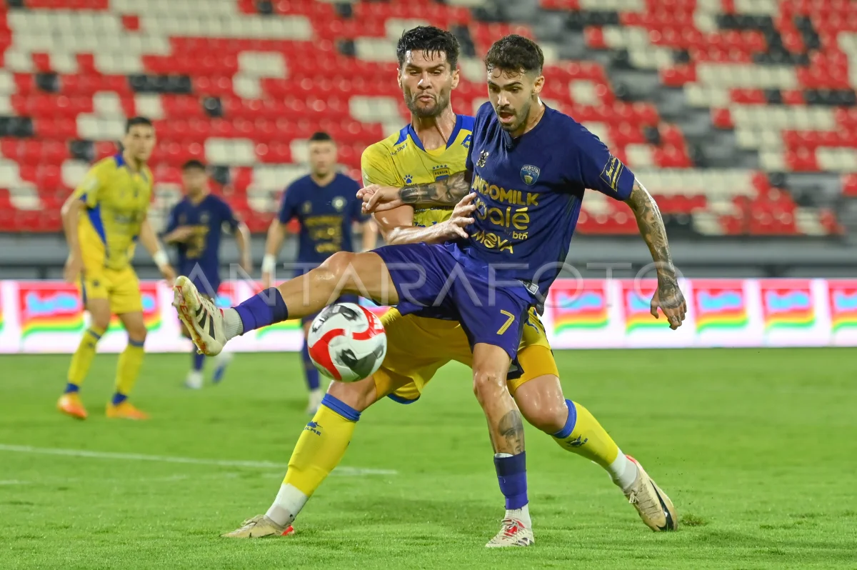 Pesepak bola Persita Rayco Rodriguez Medina (kanan) berebut bola dengan pesepak bola Persib Bandung Julio Cesar (kiri) saat pertandingan Super League 2025/2026 di Stadion Kapten I Wayan Dipta, Gianyar, Bali, Sabtu (27/9/2025). Persita mengalahkan Persib Bandung dengan skor 2-1. ANTARA FOTO/Fikri Yusuf/sgd