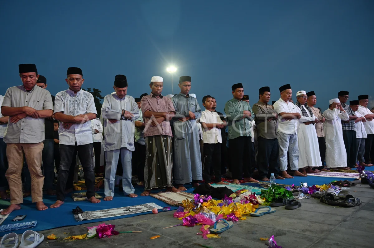 Sejumlah warga menunaikan shalat maghrib berjamaah usai melaksanakan zikir bersama memperingati tujuh tahun bencana di Palu, Sulawesi Tengah, Minggu (28/9/2025). Pemerntah Kota Palu menggelar zikir dan doa bersama untuk mengenang dan mendoakan lebih dari 4.340 korban jiwa pada bencana gempa, likuifaksi dan tsunami yang terjadi pada 28 September 2018 silam. ANTARA FOTO/Basri Marzuki/foc.