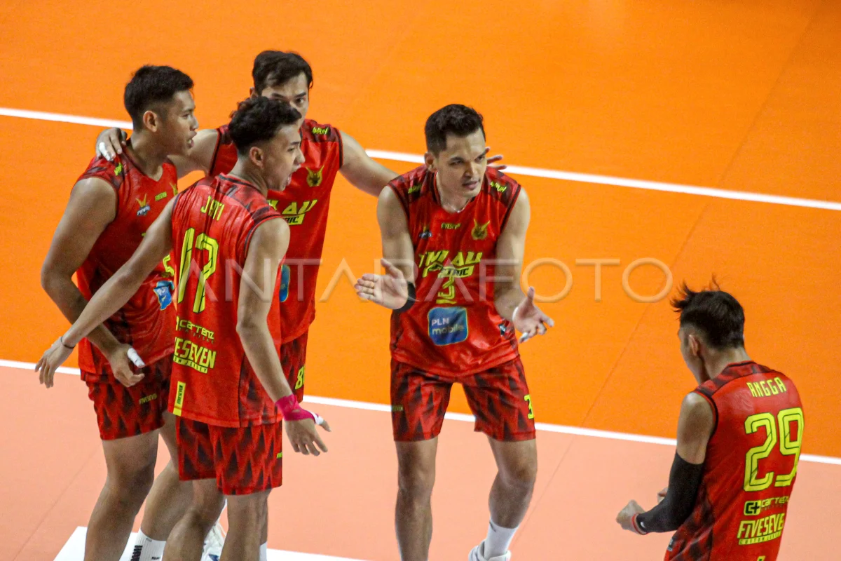 Pebola voli TNI AU Electric Ahmad Dwi Setiangga (kanan) melakukan selebrasi bersama rekannya usai mencetak poin atas Indomaret pada pertandingan babak reguler putaran kedua Livoli Divisi Utama putaran kedua di GOR Bojonegoro, Jawa Timur, Minggu (28/9/2025). TNI AU Electric berhasil menjadi juara setelah menang atas Indomaret dengan skor 3-0 (25-19, 30-28, 25-22). ANTARA FOTO/Muhammad Mada/foc.