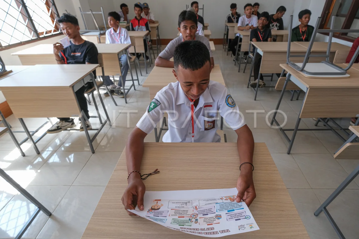Siswa membaca tata tertib sekolah saat Masa Pengenalan Lingkungan Sekolah (MPLS) di Sekolah Rakyat (SR) Terintegrasi 70 Dinas Sosial Sulawesi Tenggara di Kendari, Sulawesi Tenggara, Senin (29/9/2025). Sebanyak 100 siswa baru meliputi jenjang SMA sebanyak 50 orang dan SD sebanyak 50 orang mulai masuk asrama untuk mengikuti kegiatan pada hari pertama masa pengenalan lingkungan sekolah (MPLS) tahap 1C tahun ajaran 2025/2026. ANTARA FOTO/Andry Denisah/rwa.